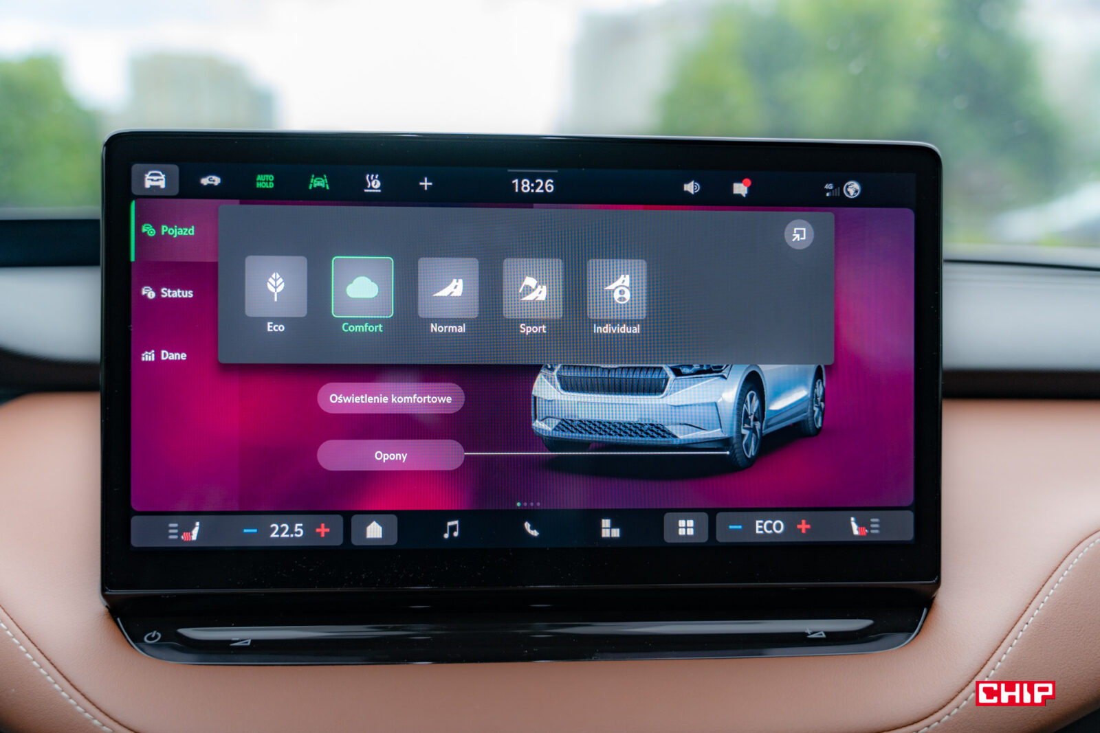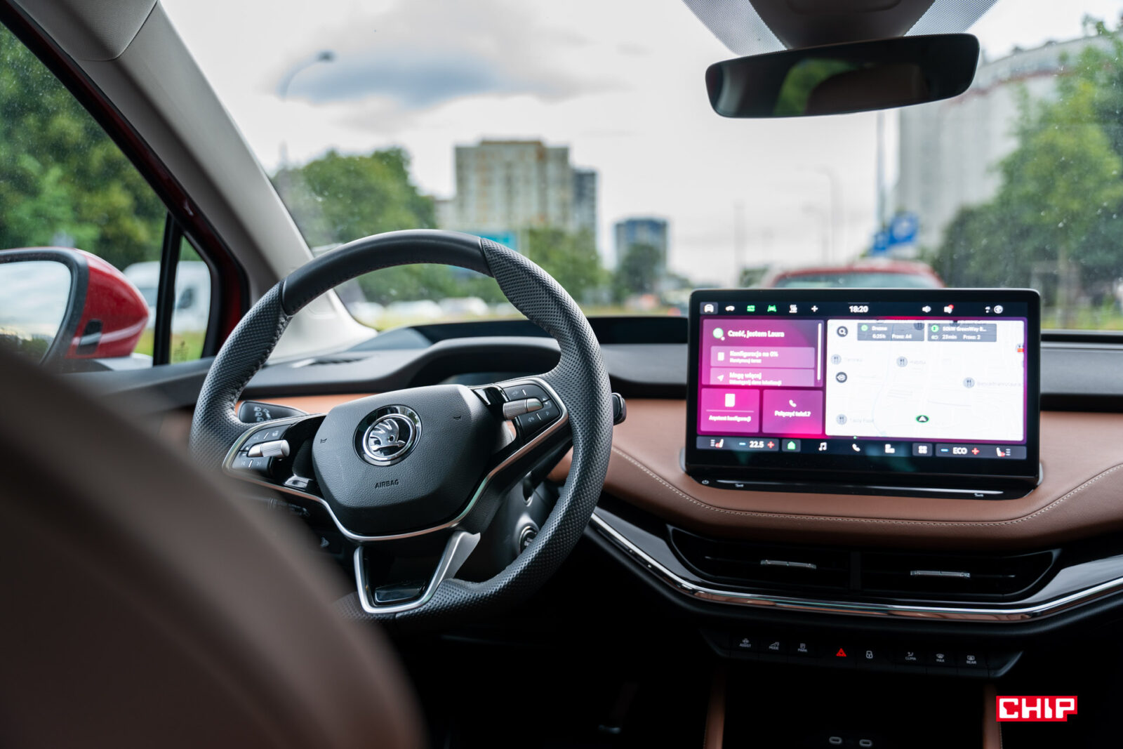 Bardzo duże ekrany główne w niektórych samochodach przeszkadzają. Ten w Enyaqu wydaje się w sam raz. Jest duży, ale nie za duży i umieszczony tak, że jest bardzo dobrze widoczny, ale nie zasłania widoczności do przodu.
