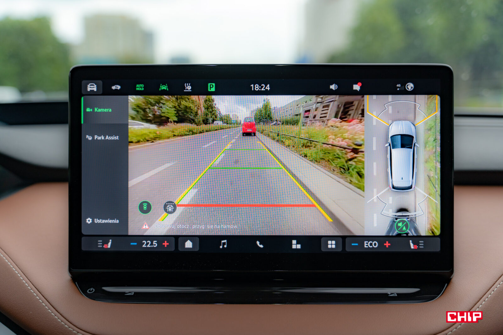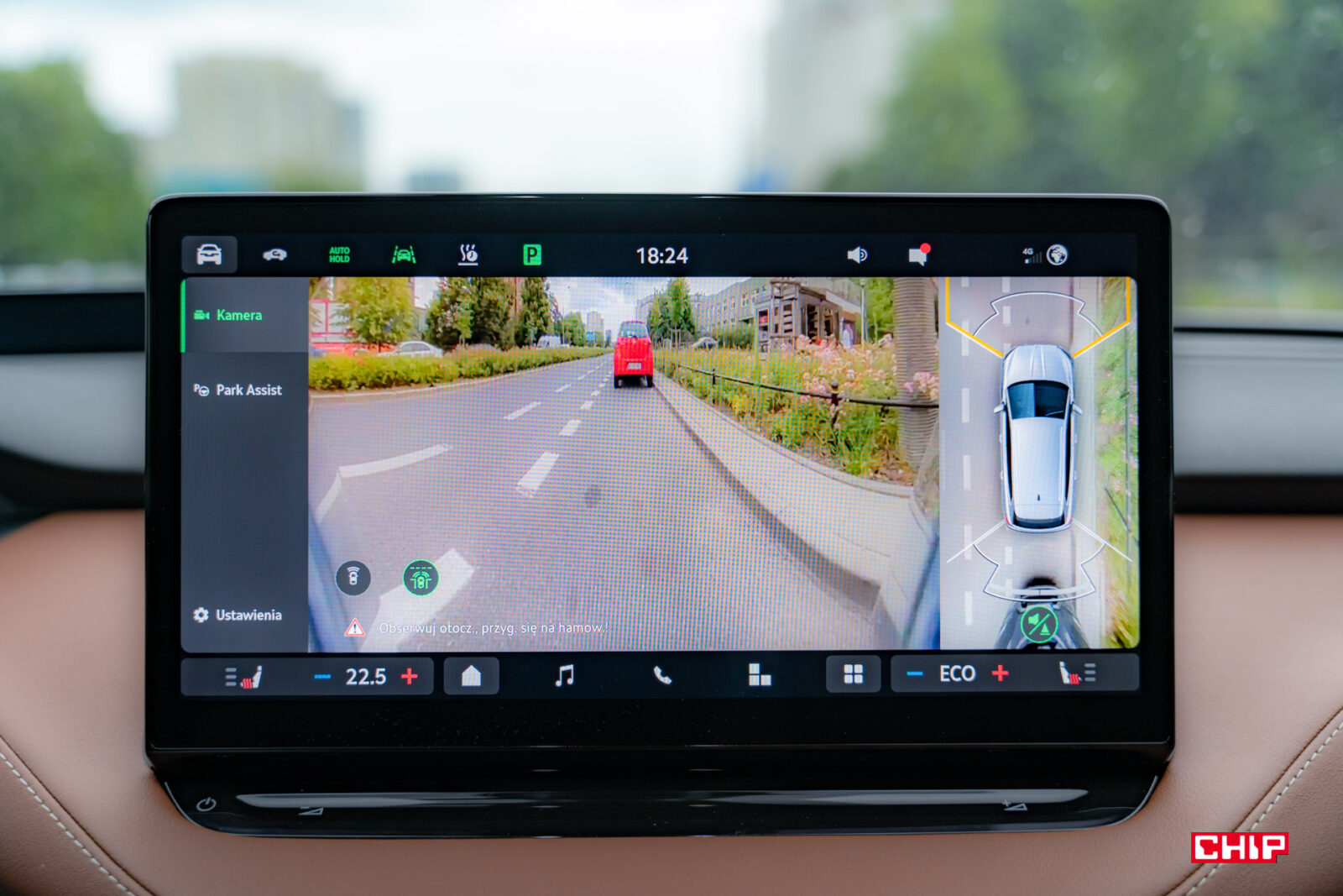 Wyświetlacz główny jest świetnej jakości. Pod względem jasności, kątów widzenia, kolorów i widać też, że rozdzielczość obrazu jest wysoka i to obnaża słabość Skody, bo pokazuje, jak niskiej jakości są kamery. Widok z kamer 360 jest czytelny i bardzo użyteczny, ale nich niska rozdzielczość rozciągnięta na ekranie o wysokiej rozdzielczości dosłownie wali po oczach. Prawdopodobnie takie same kamery znajdziemy np. w znacznie tańszej, nowej Scali, ale tam ze względu na słabszy ekran, obraz już tak źle nie wygląda.
