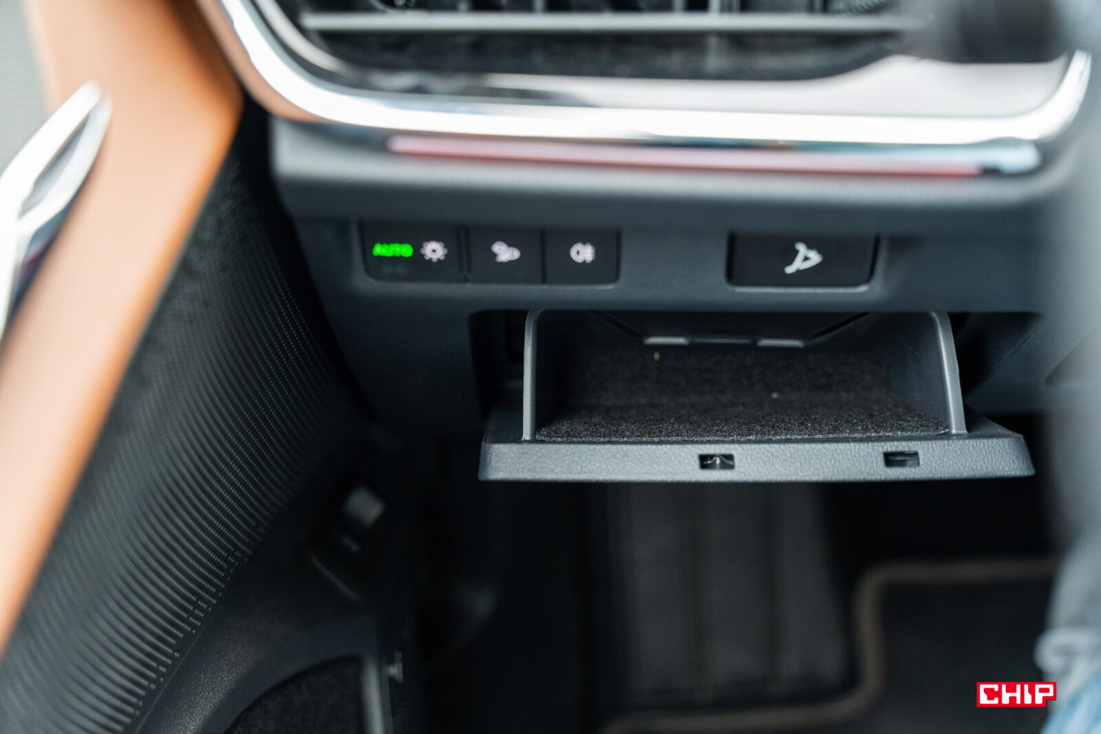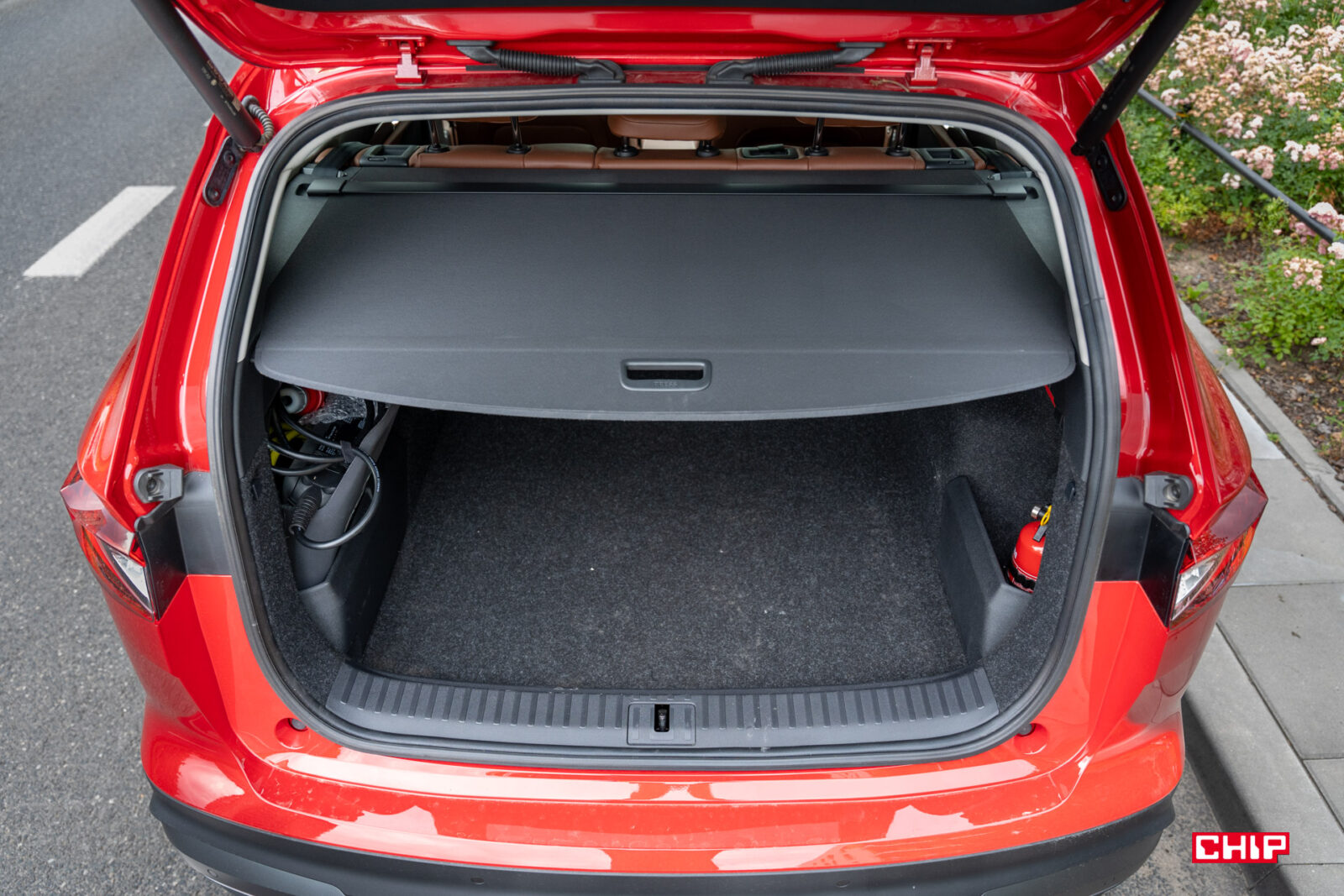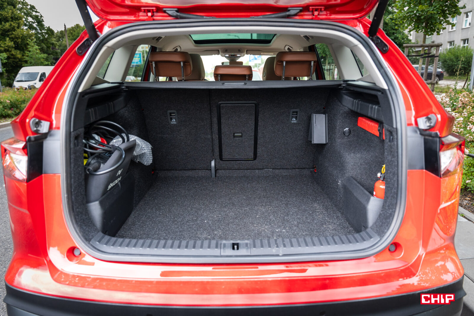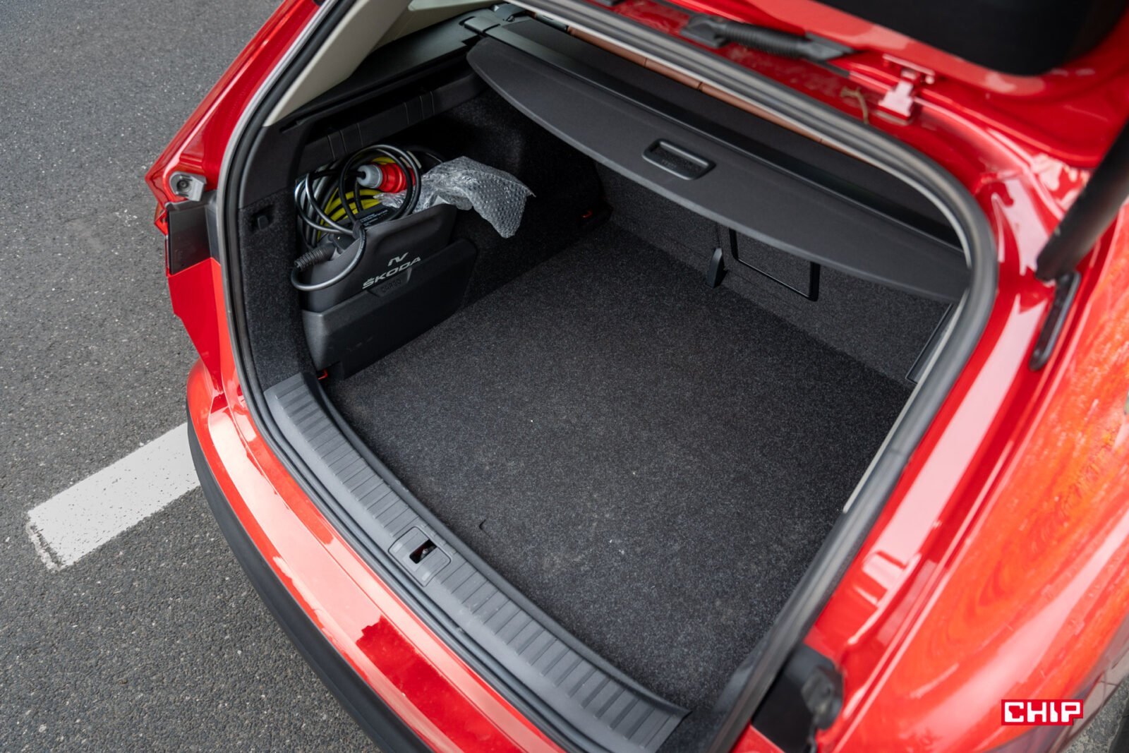 Praktyczność, z której znana jest Skoda, znajdziemy też w bagażniku. Mamy tu 585 litrów pojemności i jest to naprawdę kawałek bagażnika. Po lewej stronie znajdziemy przegródkę, która idealnie mieści kable do ładowania (standardowy oraz do ładowania domowego). Do tego mamy m.in. wysuwane haczyki, pod dwa z lewej i prawej strony.