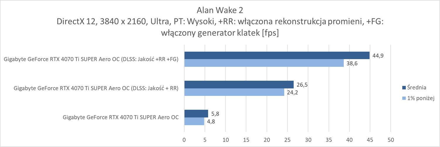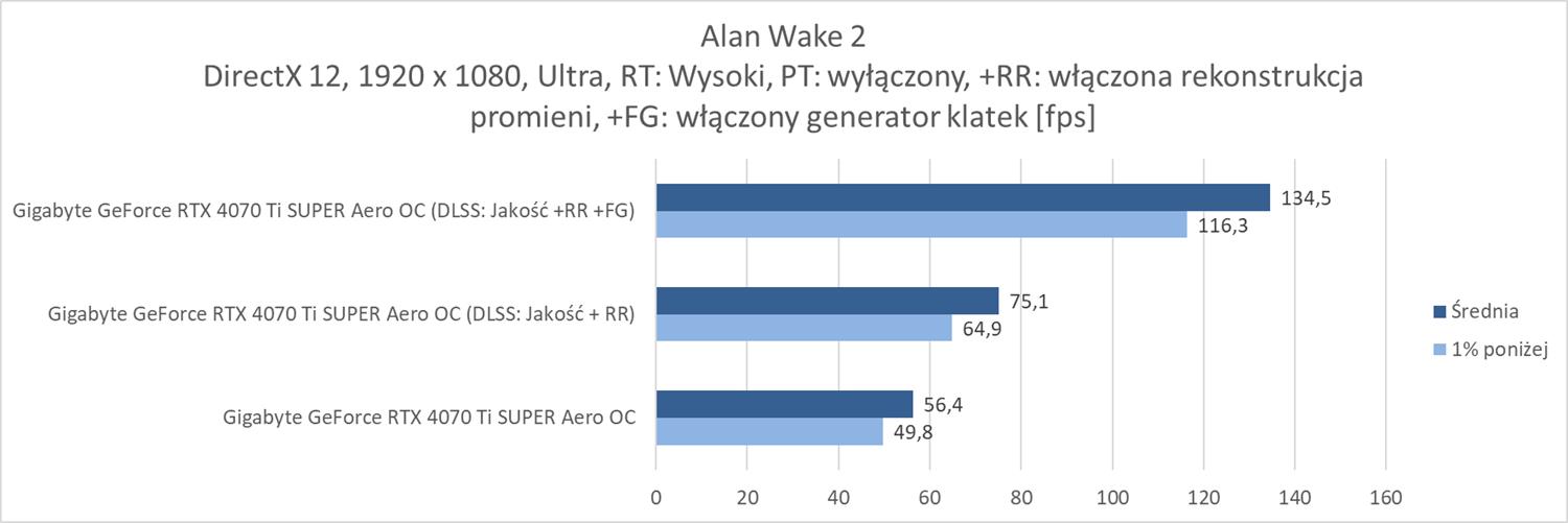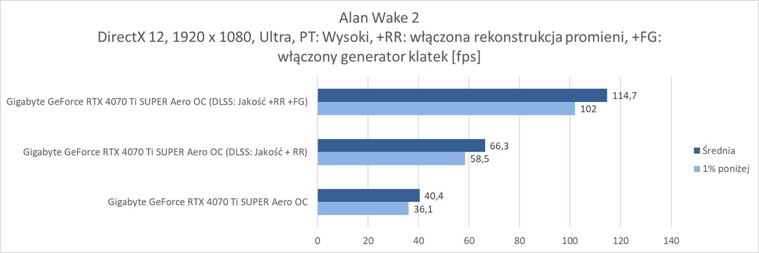 Gigabyte GeForce RTX 4070 Ti SUPER Aero OC to karta, która bardzo dobrze radzi sobie w najnowszych tytułach. W wielu grach spokojnie wystarczy ona do rozgrywki w 2560 x 1440 bez włączania DLSS. Ta technologia może przydać się wtedy w najwyższej z testowanych rozdzielczości. Również okazuje się ona niezbędna przy bardzo wymagających tytułach jak Alan Wake 2. Tutaj jeśli chcecie grać z RT czy nawet PT to bez takich dopalaczy nie ma co podchodzić. DLSS: Jakość oferuje bardzo dobrą jakość obrazu, a przy tym podbija wyniki w grach. Warto rozważyć jego włączenie nawet jeśli notujecie powyżej 60 fps – bez większej straty jeszcze trochę podbijecie wyniki w grach i dotyczy to wszystkich kart graficznych. Sam generator klatek przyda się najbardziej przy najbardziej wymagających ustawieniach czy rozdzielczościach. Bardzo mocno potrafi on podbić wyniki w grach, co zresztą widać po testowanych tytułach. Jest to technologia, która z pewnością dodaje wartości całej serii RTX 4000.