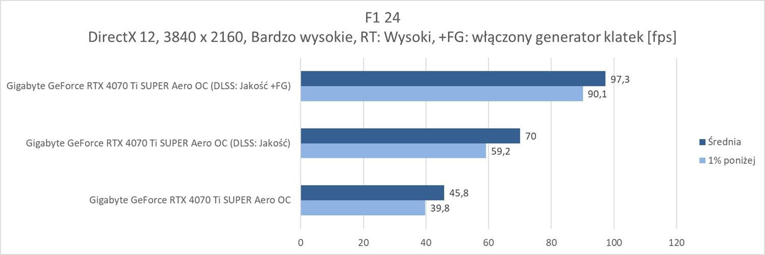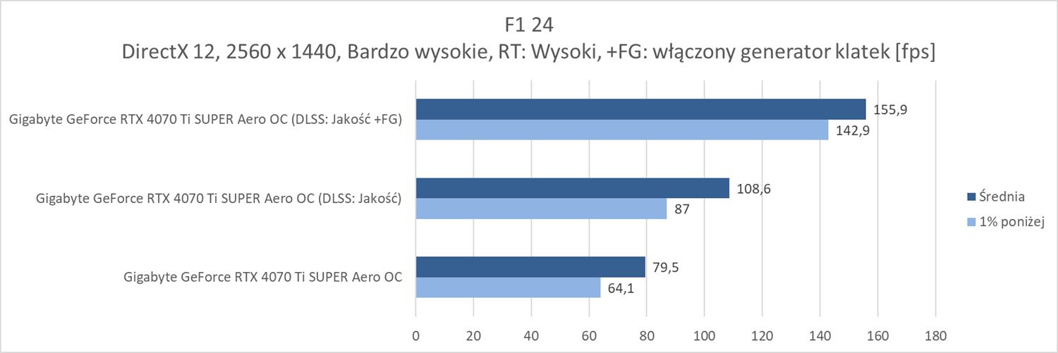 F1 24 to mniej wymagający tytuł nawet po włączeniu ray tracingu. W 1920 x 1080 spokojnie bez dopalaczy uzyskamy średnio ponad 100 fps, w 2560 x 1440 ponad 60 fps. Oczywiście po dodaniu DLSS: Jakość oraz generatora klatek ilość fps bardzo mocno wzrasta i nadal warto to rozważyć. Natomiast dopiero w ostatniej rozdzielczości mamy średnio poniżej 60 fps i tutaj przyda się nawet sam DLSS: Jakość.