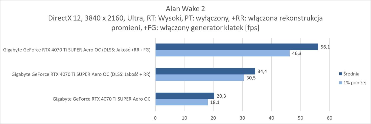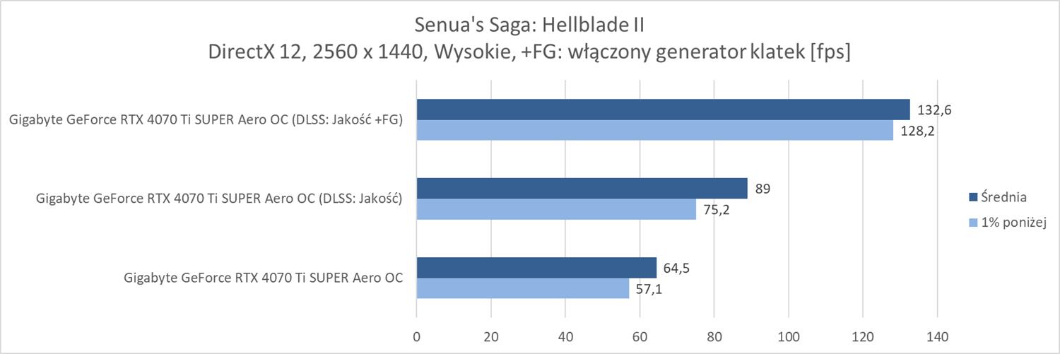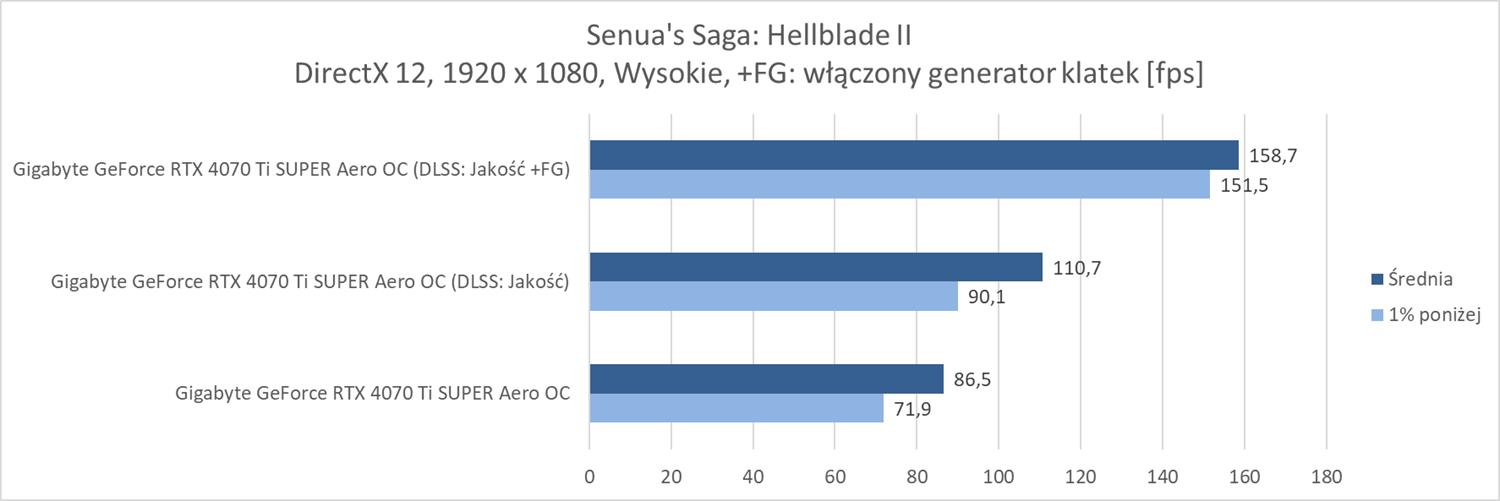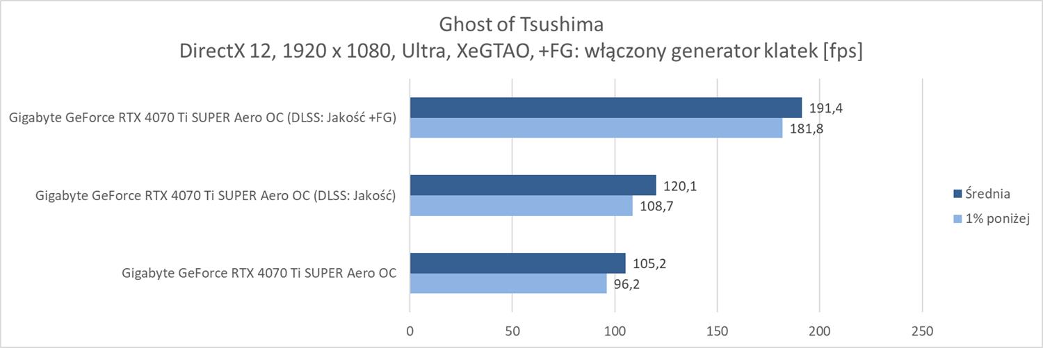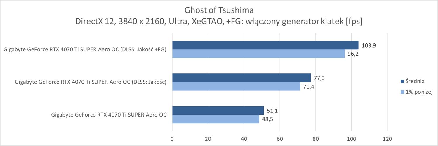Kolejny tytuł nie ma już ray tracingu. Gigabyte GeForce RTX 4070 Ti SUPER Aero OC pozwala na uzyskanie powyżej 60 fps nawet w 2560 x 1440. Warto jednak rozważyć dodanie DLSS: Jakość i FG, bowiem wtedy fps znacznie wzrastają, a gra staje się płynniejsza. W ostatniej rozdzielczości przyda się też sam DLSS: Jakość, ponieważ bez niego mamy średnio trochę poniżej 60 fps.