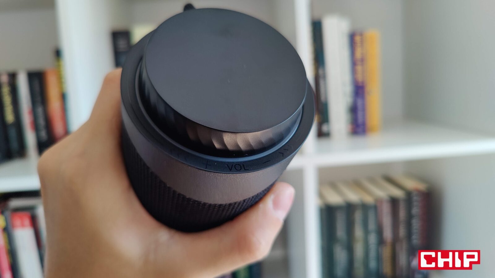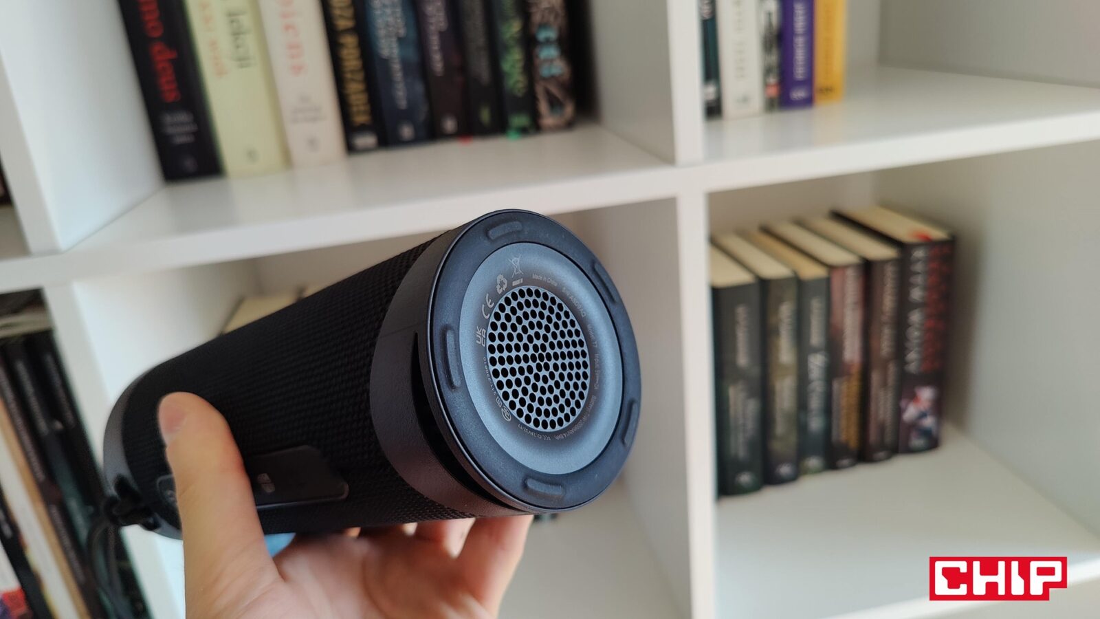 Chociaż Tronsmart zapisał się w mojej głowie jako producent głośników o rozmiarach torebek lub wielkich torb, tak T7 wpisuje się w grono głośników o znacznie mniejszych gabarytach. Forma cylindra o wymiarach 216 × 78 mm i wadze 882 gramów pozwala bez większego problemu chwycić głośnik w dłoń i ewentualnie wspomóc się dołączoną linką, którą można wykorzystać również do przytroczenia głośnika T7 do np. torby czy zawieszenia go na drzewie. Alternatywą jest postawienie go na relatywnie płaskiej powierzchni koniecznie tym konkretnym bokiem z gumowymi wstawkami. Pamiętajcie bowiem, że ten produkt Tronsmarta powinien być ciągle ustawiony wertykalnie, a nie horyzontalnie, a to przez swój charakter rozbrzmiewania nie w jednym kierunku, a pełnych 360 stopniach.
