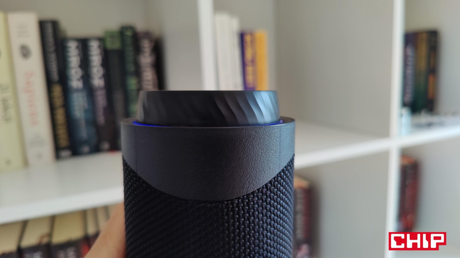 Właśnie tak – T7 to nie głośnik, którego wstawicie w róg i nagłośnicie pomieszczenie w nieregularnym stopniu. To sprzęt, który powinien znaleźć się dosłownie w centrum imprezy, aby dostarczać do uszu każdego słuchacza tę samą dawkę dźwiękowych wrażeń. Wrażeń, które generuje z wykorzystaniem łącznie 30-watowego zestawu dwóch tweeterów i pojedynczego woofera na spodzie o paśmie przenoszenia od 60 do 20000 Hz. Ten zestaw zasila akumulator o nieznanej pojemności, który po 3-godzinnym ładowaniu po USB-C ma wystarczyć na nawet 12 godzin odsłuchu, zależnie od poziomu głośności oraz ustawień podświetlenia, bo oczywiście nie zabrakło w tym modelu wprawdzie skromnego, bo ograniczonego do niewielkiego okręgu na górze, ale i tak wizualnie potężnego efektu RGB.