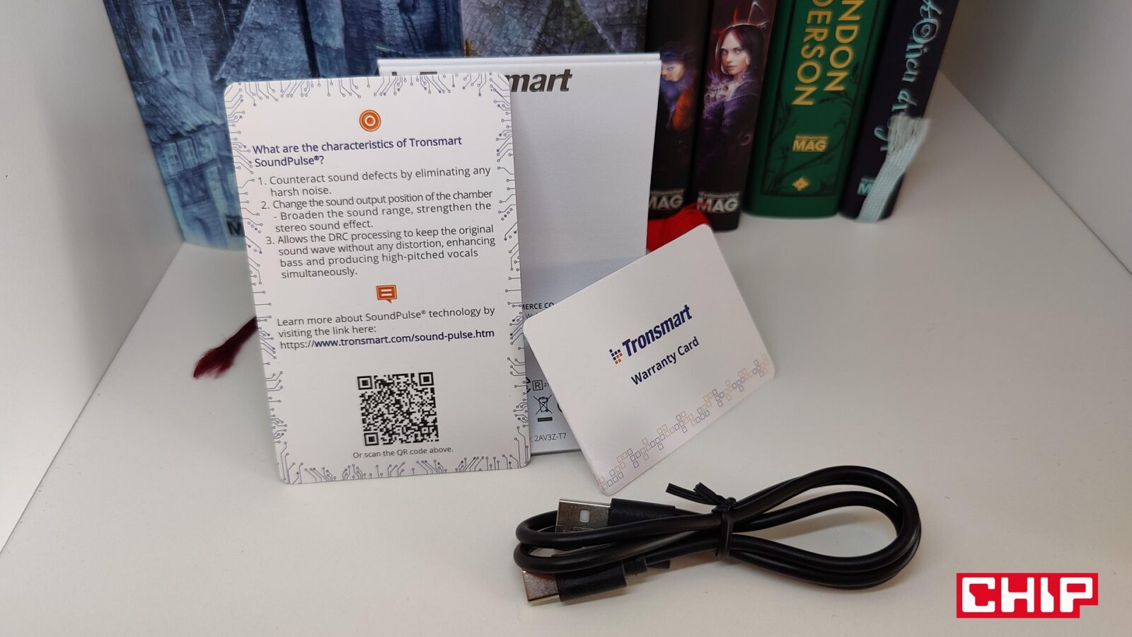 Tronsmart sprzedaje swoje głośniki T7 w solidnym kartonowym pudle, którego wieko musimy zsunąć, zanim dorwiemy się do środka. W nim czeka na nas dobrze zabezpieczony głośnik, krótki przewód USB-A do USB-C w gumowym oplocie oraz papierologia, w której nie wyczytacie nic aż tak ciekawego.