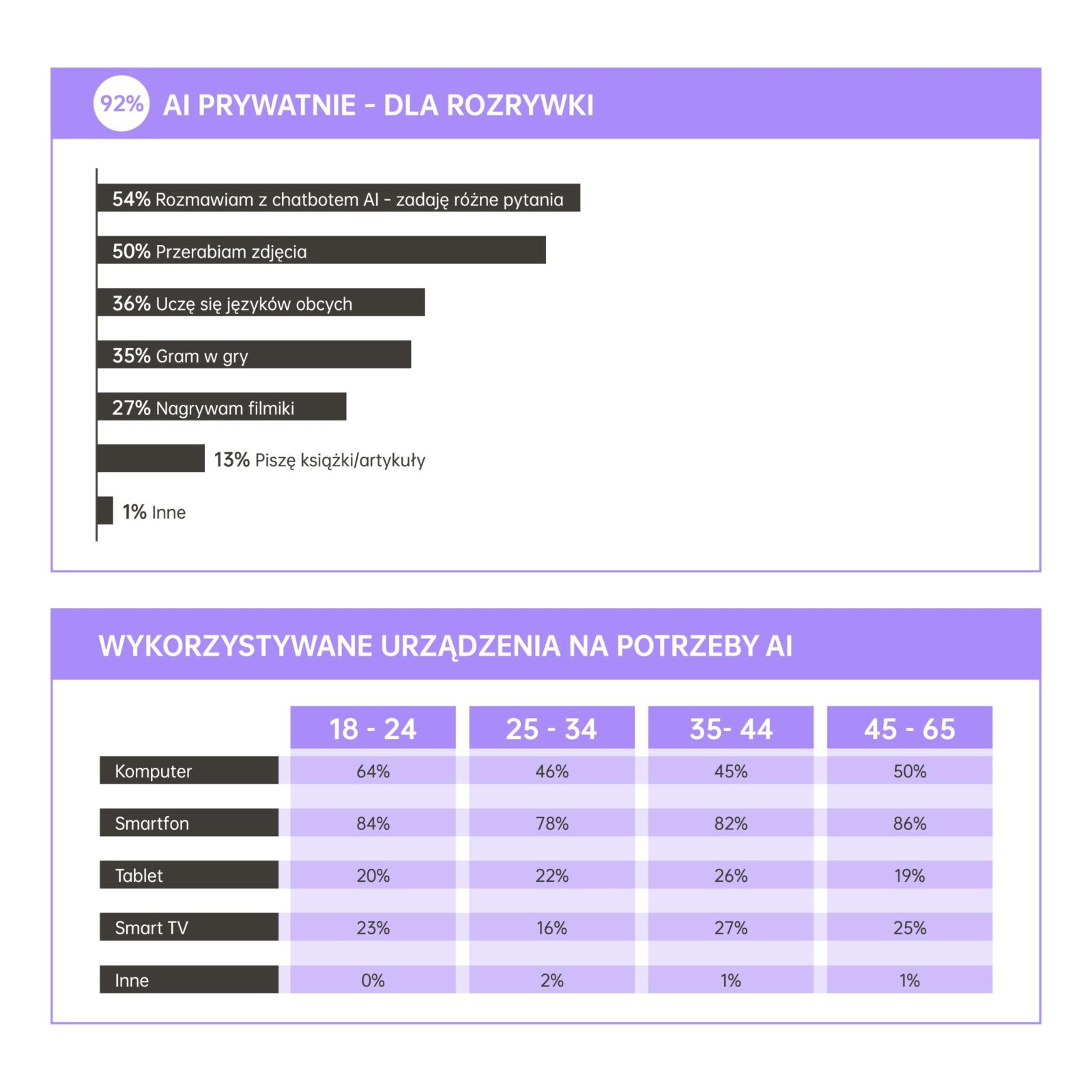 Z narzędzi AI wolimy korzystać do pracy czy do prywatnej rozrywki? Aż 92% respondentów korzystających z narzędzi AI robi to w celach prywatnych. Nie są rozwiązania rzucające na kolana najpotężniejsze karty graficzne czy wychodzące znacząco poza to, co robiliśmy wcześniej w internecie. Przede wszystkim rozmawiamy z chatbotami AI i powodów tej sytuacji widzę kilka. Poza zwykłą ciekawością, to sposób na otrzymywanie rozbudowanych odpowiedzi, wspomaganie się podczas pracy lub edukacji czy sposób na układanie planów dnia, diety lub wakacji.