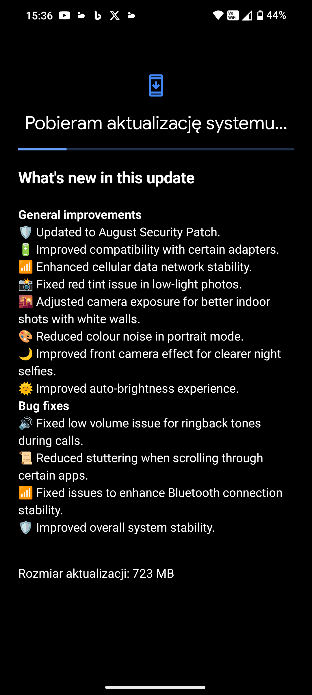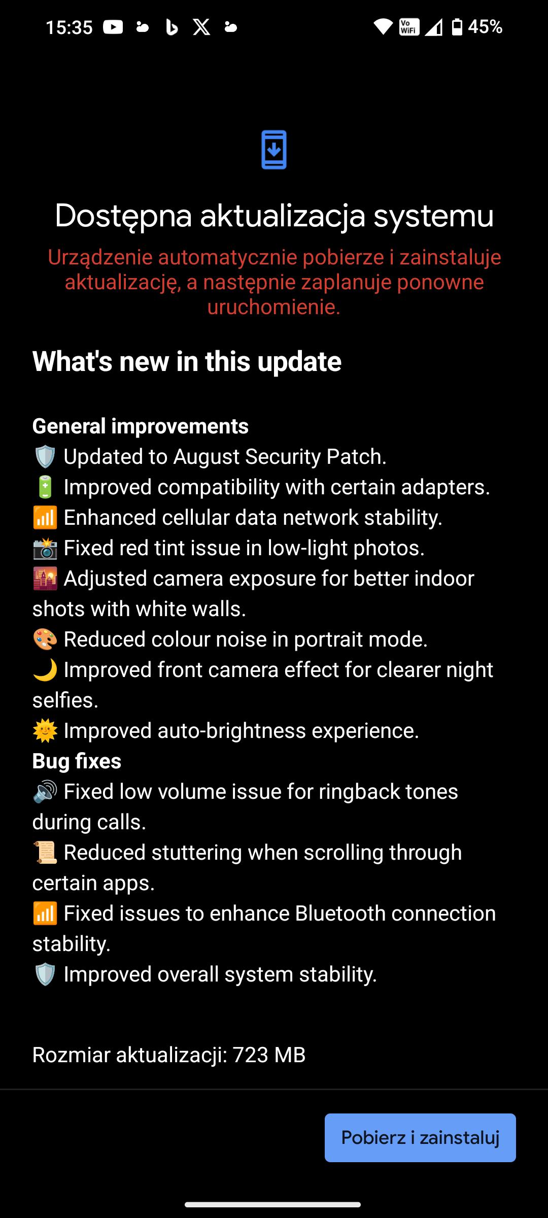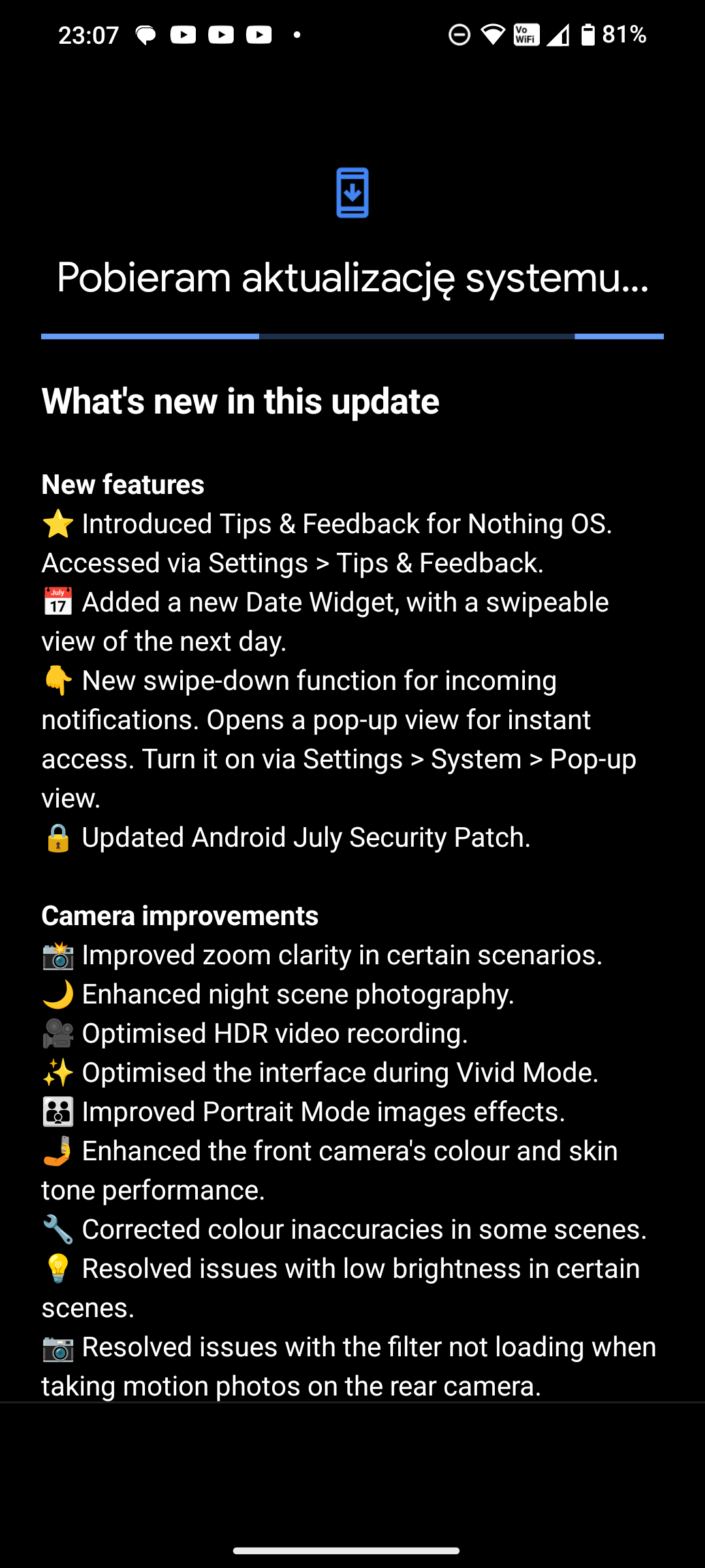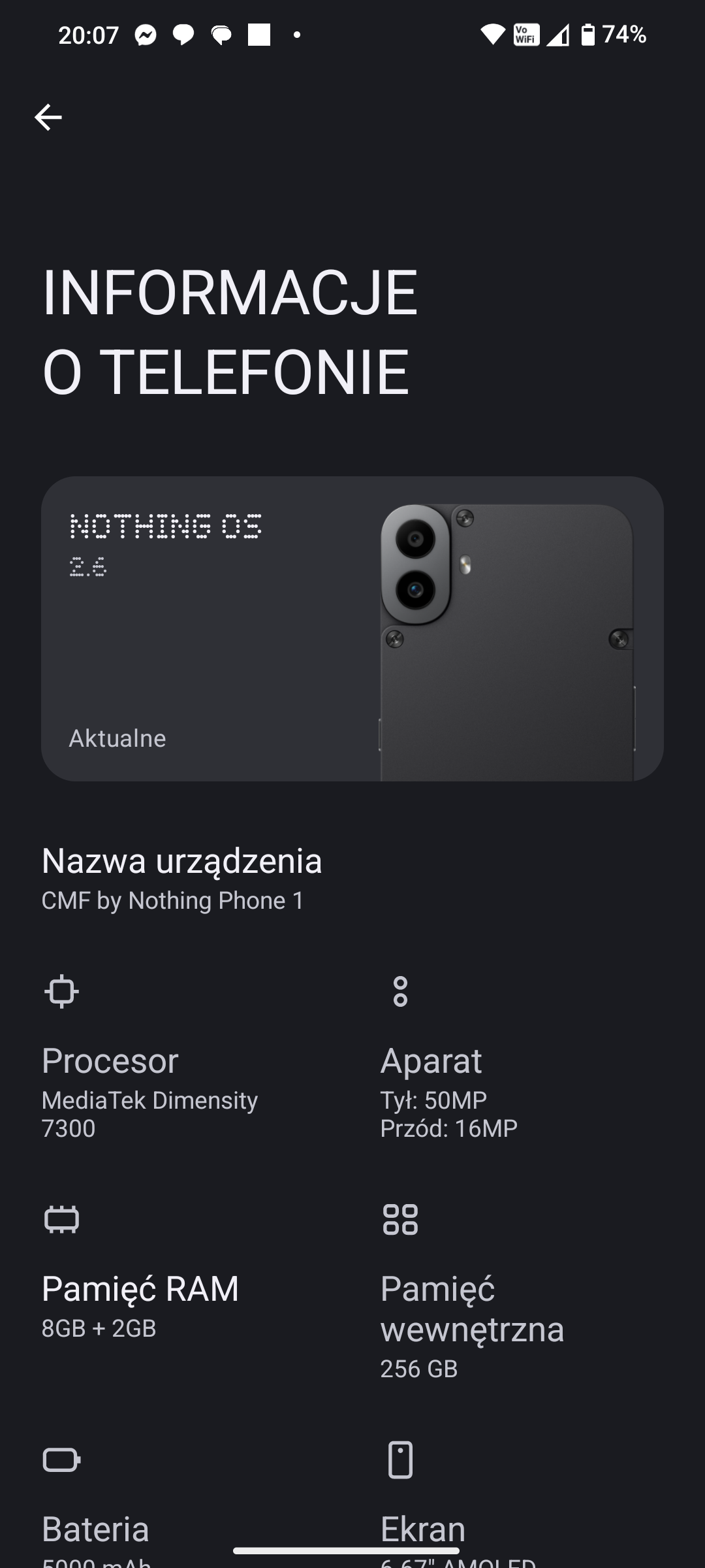 CMF Phone 1 zadebiutował z Androidem 14 z nakładką Nothing OS 2.6. Po premierze smartfon dostał już dwie aktualizacje, a w chwili, gdy to piszę, instaluje się kolejna, tym razem naprawdę duża (723 MB). Po jej instalacji aktualizacje zabezpieczeń datowane są na 1 sierpnia, a aktualizacja systemowa Google Play na 1 lipca 2024 roku – czyli jest znakomicie, gdyż w tym momencie nawet Pixel 8 nie dostał jeszcze sierpniowych poprawek.