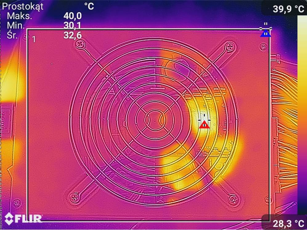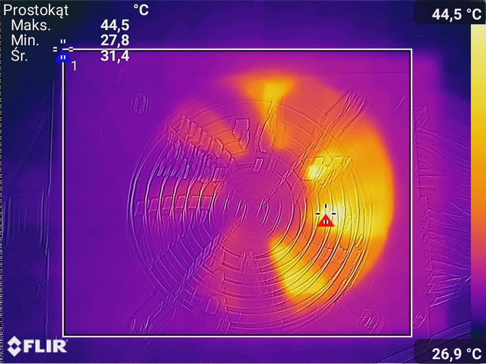 Spoczynek to wyświetlanie tylko pulpitu. Obciążeniem był FurMark oraz Cinebench R23. Zdjęcia termowizyjne wykonałem dzięki smartfonowi CAT S61.