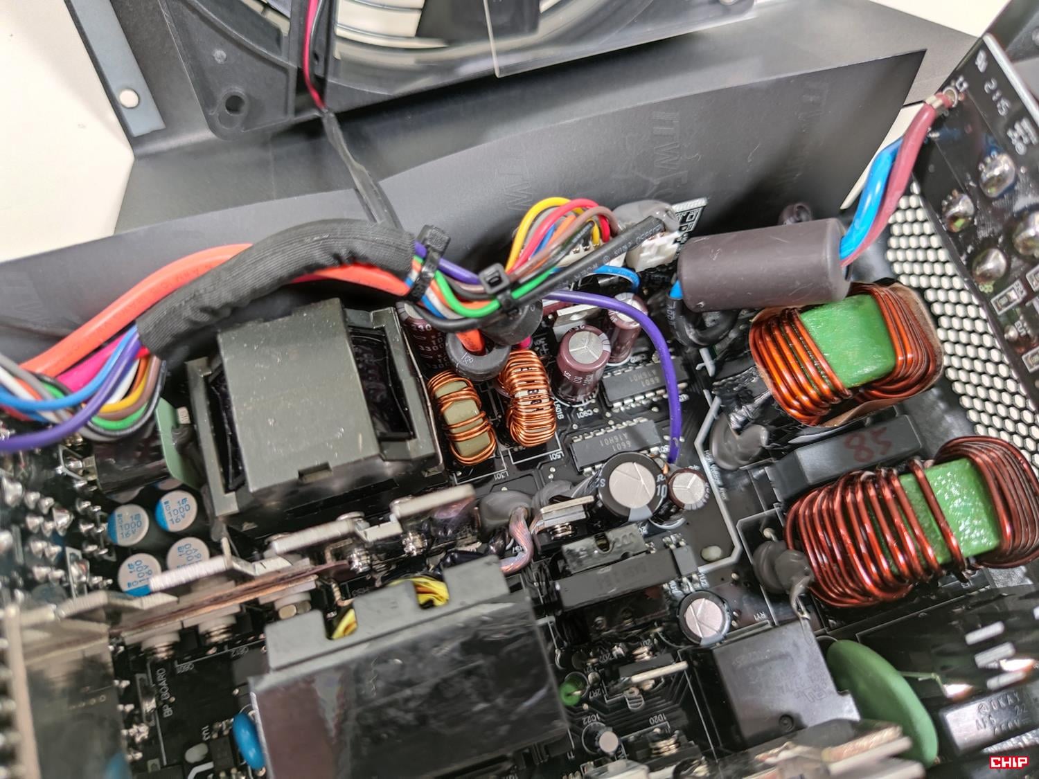 Wnętrze jest, jak zawsze u FSP, bardzo dobrze wykonane. Dwa największe kondensatory mają parametry 450 V, 560 uF oraz mogą pracować w temperaturze do 105°C. Są one produkcji japońskiej firmy TK. Wśród pozostałych kondensatorów znajdziemy też konstrukcje Rubycona. Zasilacz ma przetwornicę DC-DC, aktywne PFC i zgodność z ATX 2.4. Szkoda jednak, że nie jest to już model ATX 3.0. Zabezpieczenia są następujące: