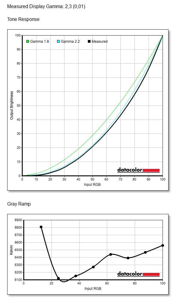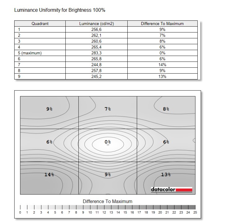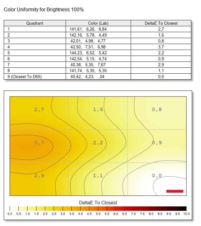 Nadszedł więc czas na najważniejsze – zweryfikowanie możliwości matrycy VA w Gigabyte GS27QC specjalnym kolorymetrem. Wedle wyplutych przez niego testów różnice w jasności maksymalnej rzędu 13-14 procent przypadają na oba dolne rogi ekranu, gdzie spadek jasności względem najjaśniejszego miejsca (środka) wynosi około 38 nitów (~245 vs 283,3), a spójność kolorów wypada w tej kwestii bardzo dobrze. Oprogramowanie oceniło też rozpiętość tonalną na wysokie 9/10 oraz punkt bieli na 9/10, więc poza spójnością jasności oraz odwzorowaniem kolorów, Gigabyte GS27QC wypada bardzo dobrze, jak na monitor przeznaczony głównie do grania w dynamiczne produkcje.