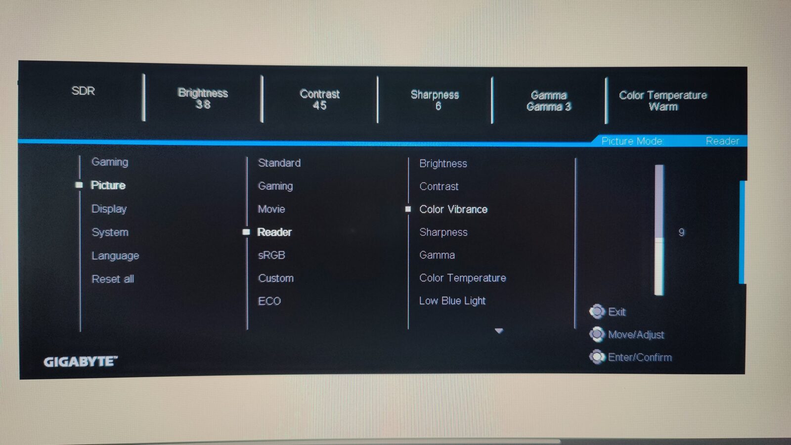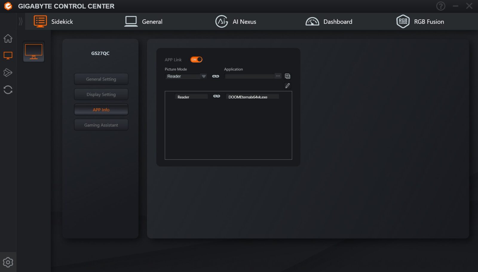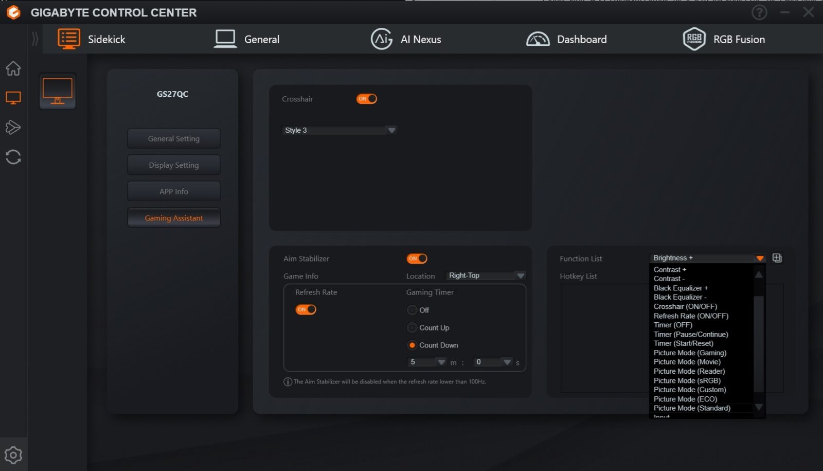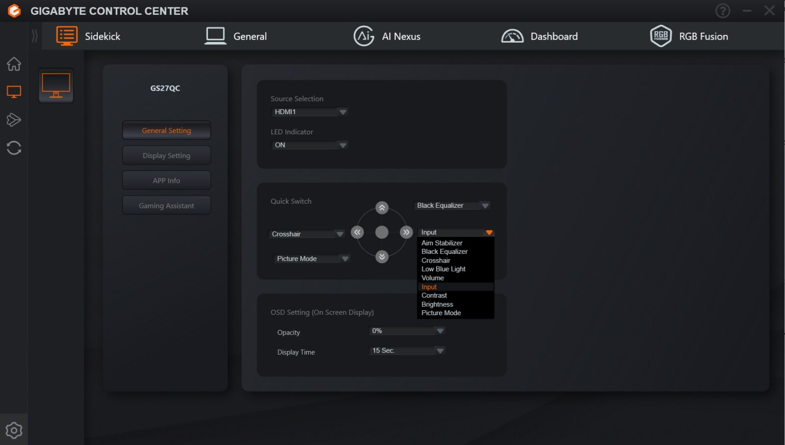 Gigabyte GS27QC ma też coś specjalnego, bo dostęp do opcji zarówno z poziomu 4-kierunkowego przycisku na dolnej krawędzi, jak i z aplikacji Gigabyte do zainstalowania na komputerze, która naturalnie jest bardziej przyjazna i co najważniejsze, zmiany w niej od razu wpływają na monitor.