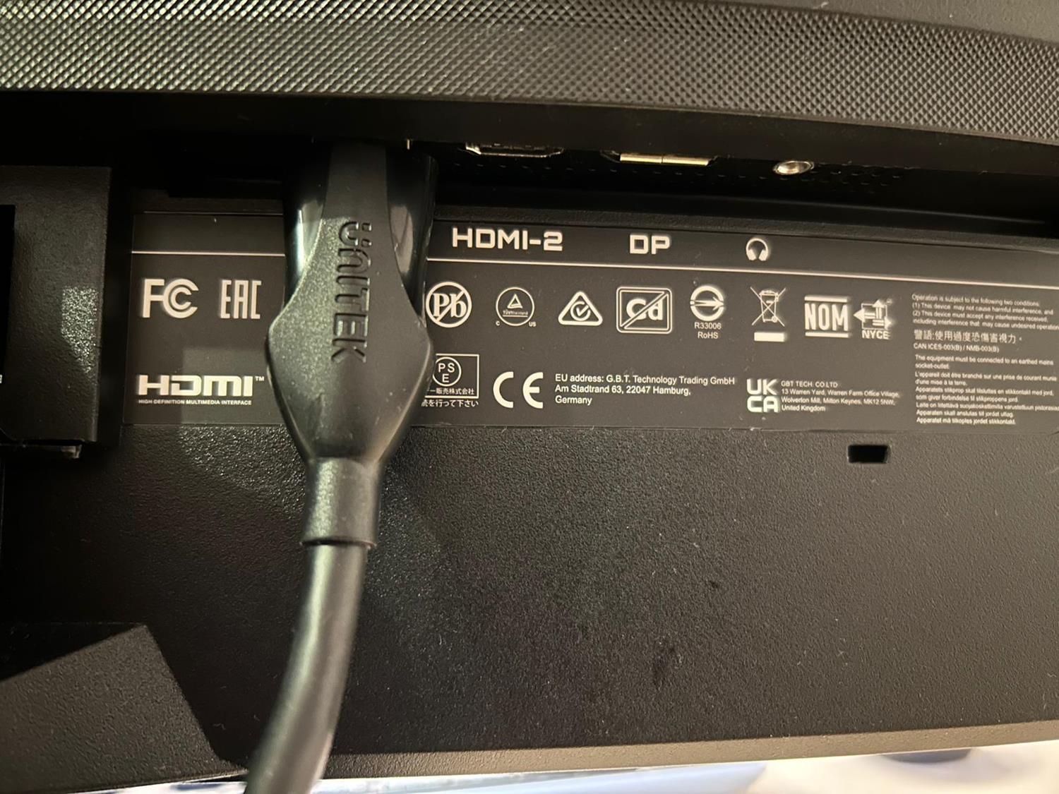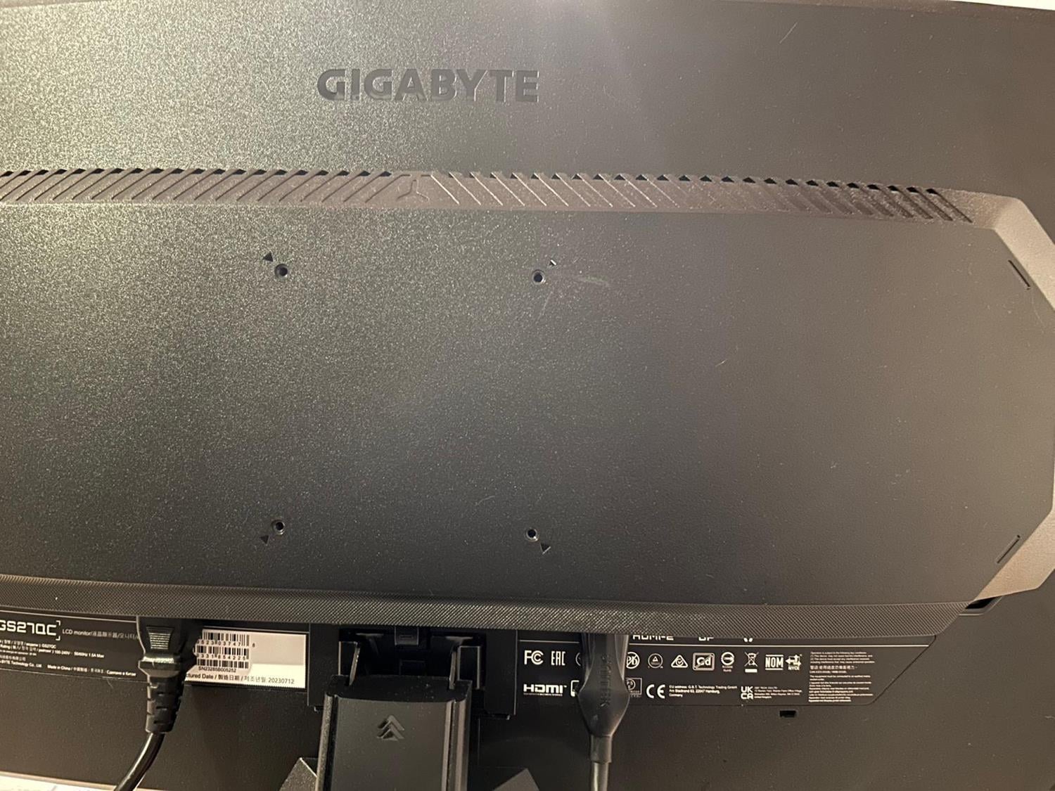 Monitor jest smukły i wszystkie połączenia są z tyłu na dolnej krawędzi panelu I/O – osobiście preferuję podpinać się do wyświetlacza „na wprost”, na bocznej krawędzi albo z tyłu, natomiast rozumiem logikę tego rozwiązania – normalny użytkownik podłączy wszystkie dwa albo trzy kable raz, gdy będzie instalował monitor i nie dotknie ich przez najbliższe 10 lat. Moim głównym zastrzeżeniem przy podłączeniach od dołu jest to, że wygodnie jest monitor obrócić lub pochylić przy podpinaniu, a to jest niebezpieczne, zwłaszcza z zakrzywionym panelem i wąską ramką – upadek albo wgniecenie matrycy nie będzie niczym przyjemnym. Wychodząc naprzeciw temu Gigabyte podpisał lokalizacje odpowiednich złącz na tylnym panelu, więc jeśli uda się tam zajrzeć, będzie trochę prościej. Skoro mowa o złączach – dostępne są dwa wejścia HDMI, jedno Display Port i wyjście słuchawkowe 3,5 mm (tzw. mały jack). W tym miejscu muszę wspomnieć o tym, że testowany przeze mnie monitor od czasu do czasu potrafił długo się włączać, gdy był podpięty po Display Port – nie dało się wejść do BIOS-u/UEFI, choć komputer się włączał i dopiero pokazywał pulpit systemu po zabootowaniu. Takie zachowanie nie miało miejsca podczas podłączenia po HDMI, natomiast może to być kwestia specyficznej konfiguracji lub ustawień startu komputera (np. Fast Boot) – zaobserwowałem to przy użyciu GTX 770 i RTX 2060.