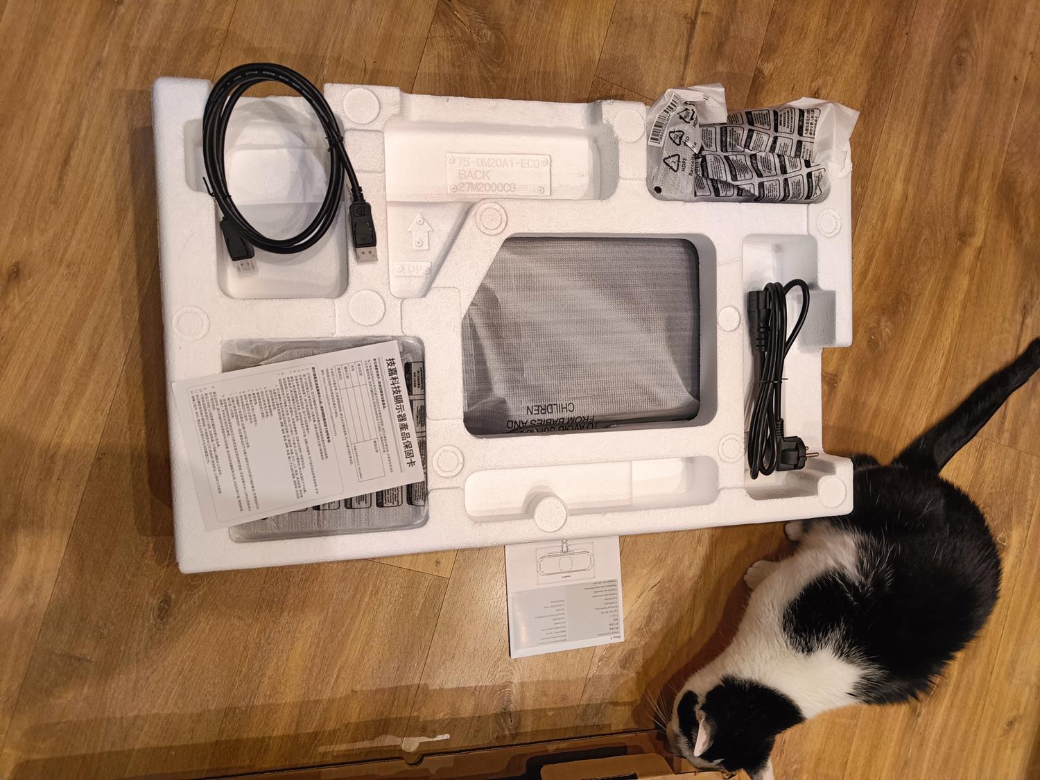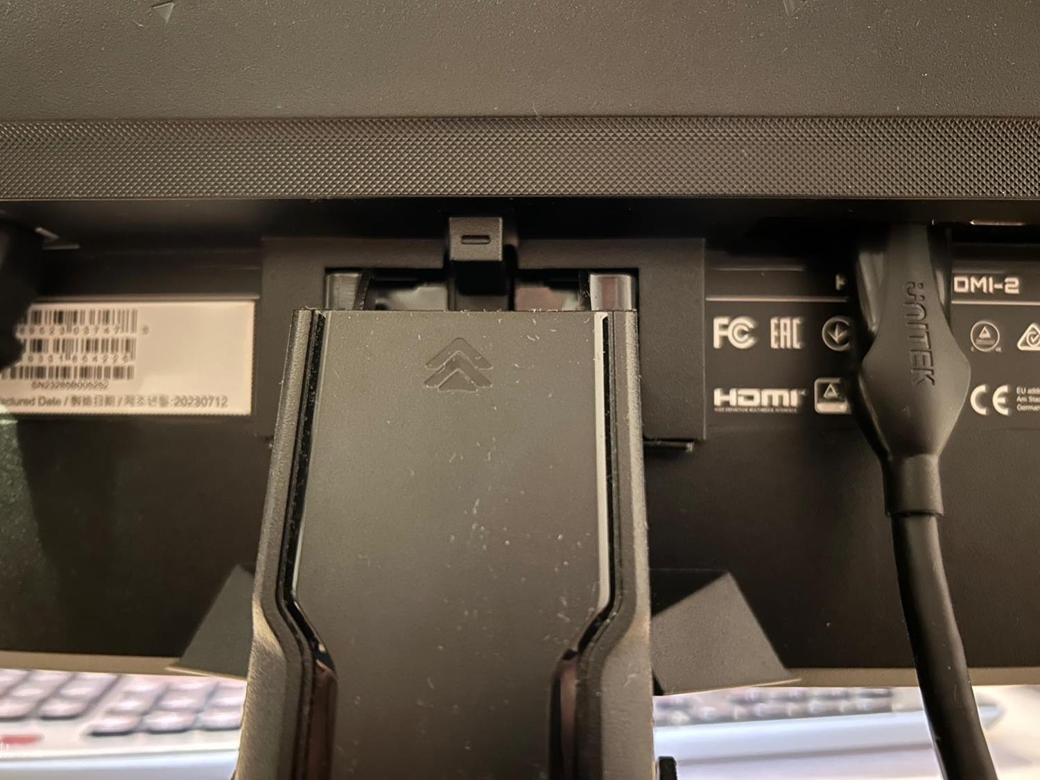 Zaczynając od początku – monitor przychodzi w pudle zabezpieczony styropianową pokrywą, w komplecie była dwuczęściowa podstawka, którą można złożyć bez użycia narzędzi, a która wpasowuje się w uchwyt z tyłu monitora też bez użycia dodatkowych narzędzi. Do tego w komplecie miałem kabel zasilający i Display Port, więc jeśli ktoś preferuje HDMI, trzeba się w niego zaopatrzyć samemu (warto wybrać odpowiedni kabel, najlepiej z obsługą protokołu 2.1 – w którymś momencie złapałem za jakiś noname leżący na wierzchu w szufladzie, a potem dziwiłem się, że mam jedynie dostępne 60 Hz). Istnieje też możliwość podpięcia uchwytu w standardzie VESA 100×100 mm, a z racji tego, że niedawno montowałem monitory na uchwytach na swoim stanowisku, postanowiłem przymierzyć uchwyt – montaż był bezproblemowy, otwory są właściwie zwymiarowane i nic nie zawadzało.