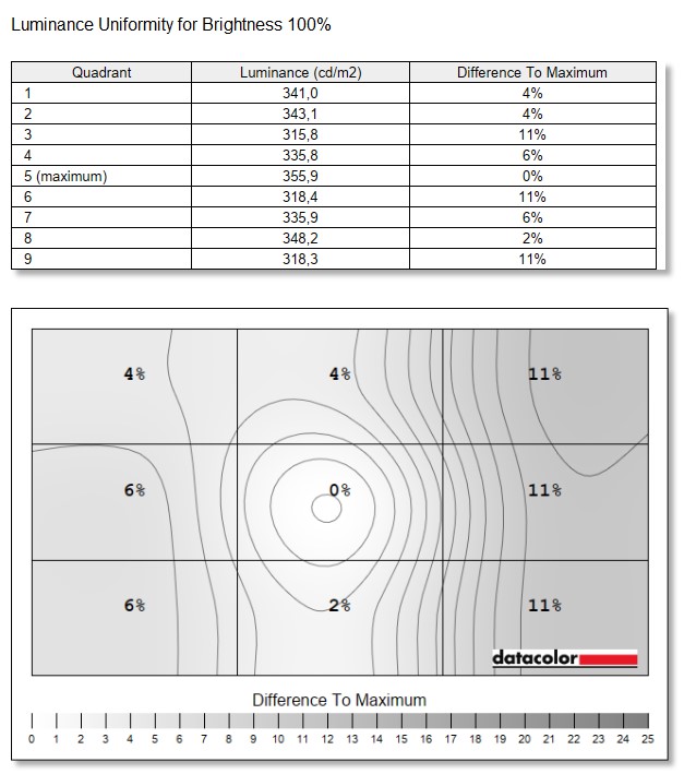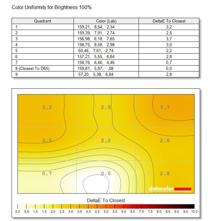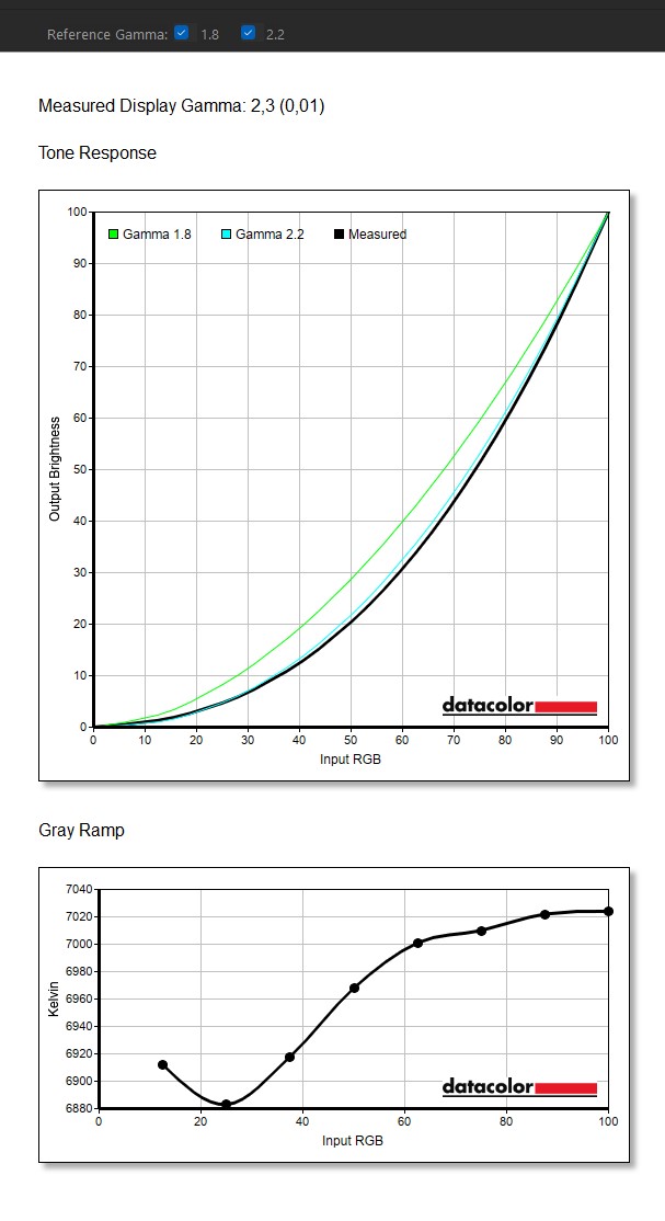 27-calowa matryca IPS o wielkości 596 × 335 mm zajmuje większość przedniego panelu monitora, o ile pominiecie dolną belkę o znacznej grubości. To jest już jednak standard i dlatego, zamiast narzekać na tę około 1,5-centymetrową belkę, lepiej skupić się na cieniutkich ramkach na bokach i górze. Zwłaszcza że okalają one bardzo dobrej jakości matrycę pod matową osłoną o rozdzielczości 2560 × 1440 pikseli, 240-Hz odświeżaniu, kontraście 1000:1, jasności 350 nitów i certyfikacie VESA Display HDR400. Wedle producenta pokrywa ona 140% palety sRGB i 92% DCI-P3, a do tego odznacza się 1-ms opóźnieniem typu Grey to Grey, co w połączeniu z odświeżaniem aż 240 razy na sekundę, czyni z każdej dynamicznej gry wręcz ucztę dla oka. Jak z kolei wypada w teście z wykorzystaniem kalibratora Spyder Elite? W skrócie? Wedle wykonanych pomiarów Gigabyte M27Q X wypada świetnie praktycznie pod każdym względem.
