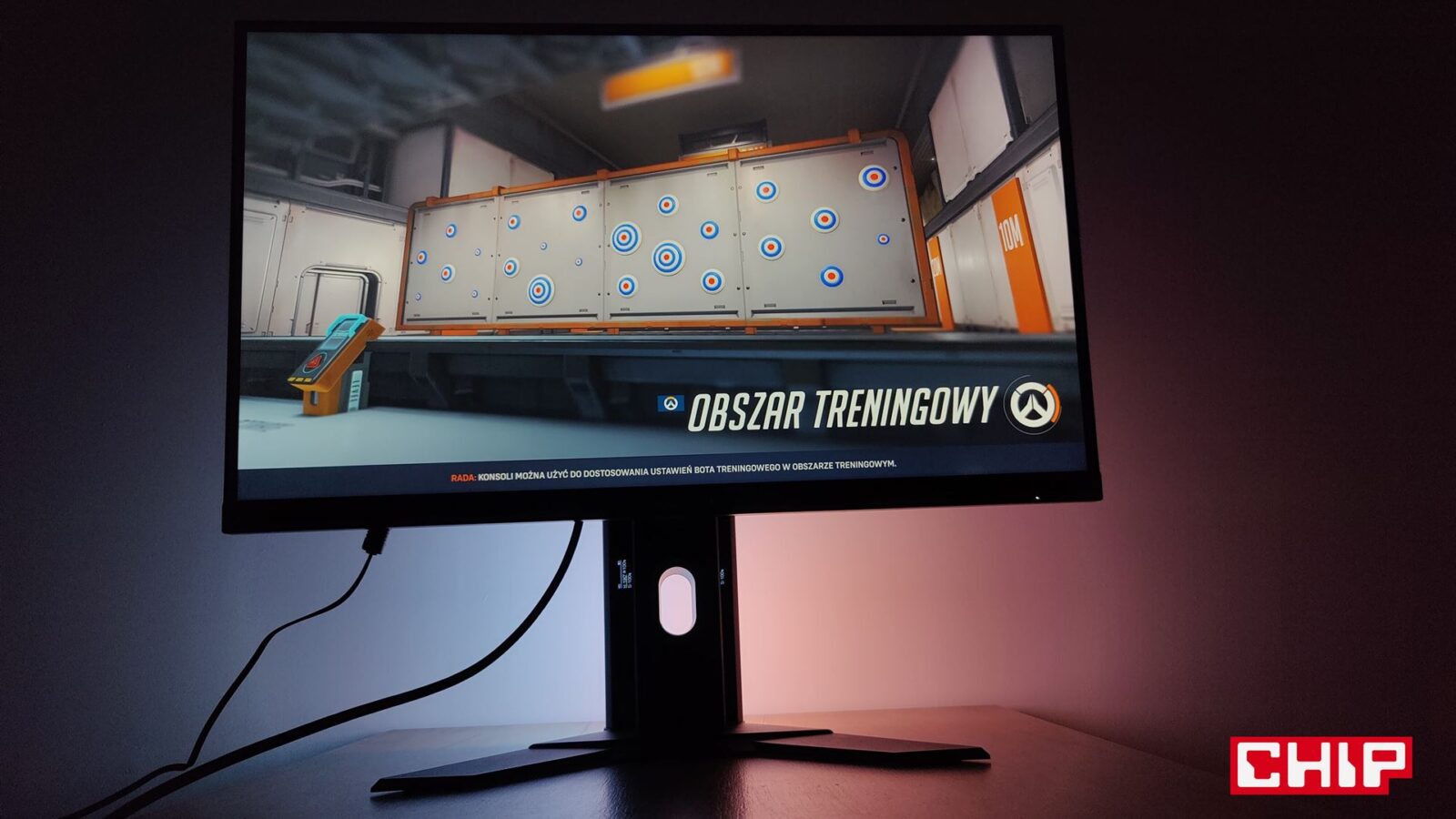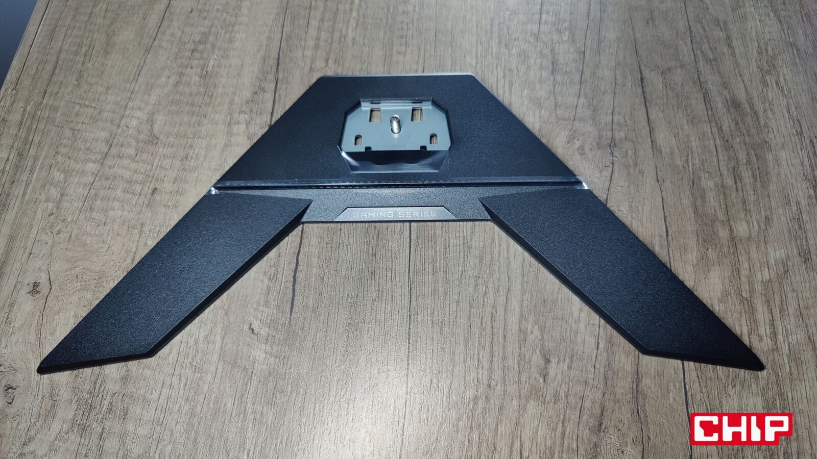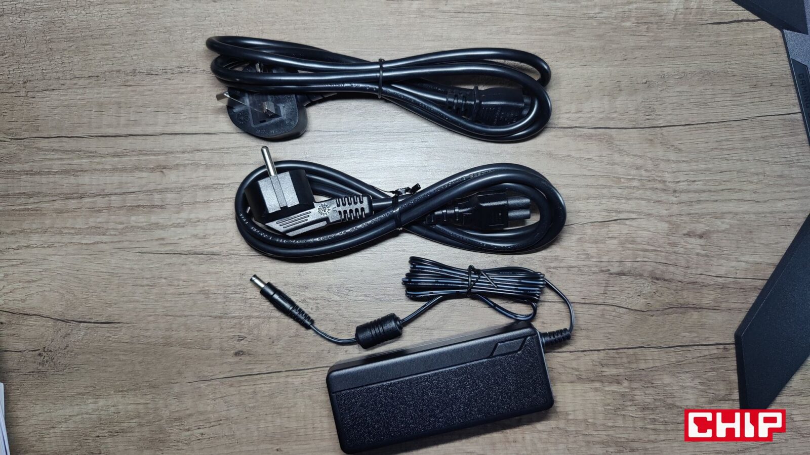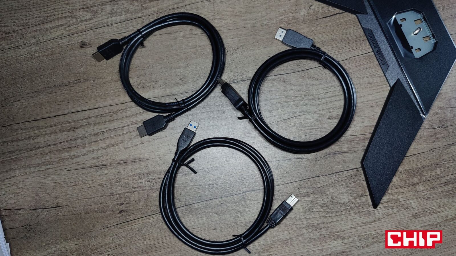 Wyposażenie obejmuje bowiem zasilacz, długi przewód zasilający, HDMI, DisplayPort i USB typu B do typu A, a dodatkowo tradycyjną papierologię. Spokojnie jednak – proces podłączania monitora jest banalny – wystarczy tylko wpiąć zasilanie oraz przynajmniej jeden przewód sygnałowy i można już grać. Zwłaszcza że dołączona w zestawie podstawa trójkątna oferuje regulacje wysokości do aż 130 mm, co w połączeniu z opcją dostosowania wychylenia (od -5 do +20 stopni) umożliwi ergonomiczne ustawienie ekranu na części stanowisk.