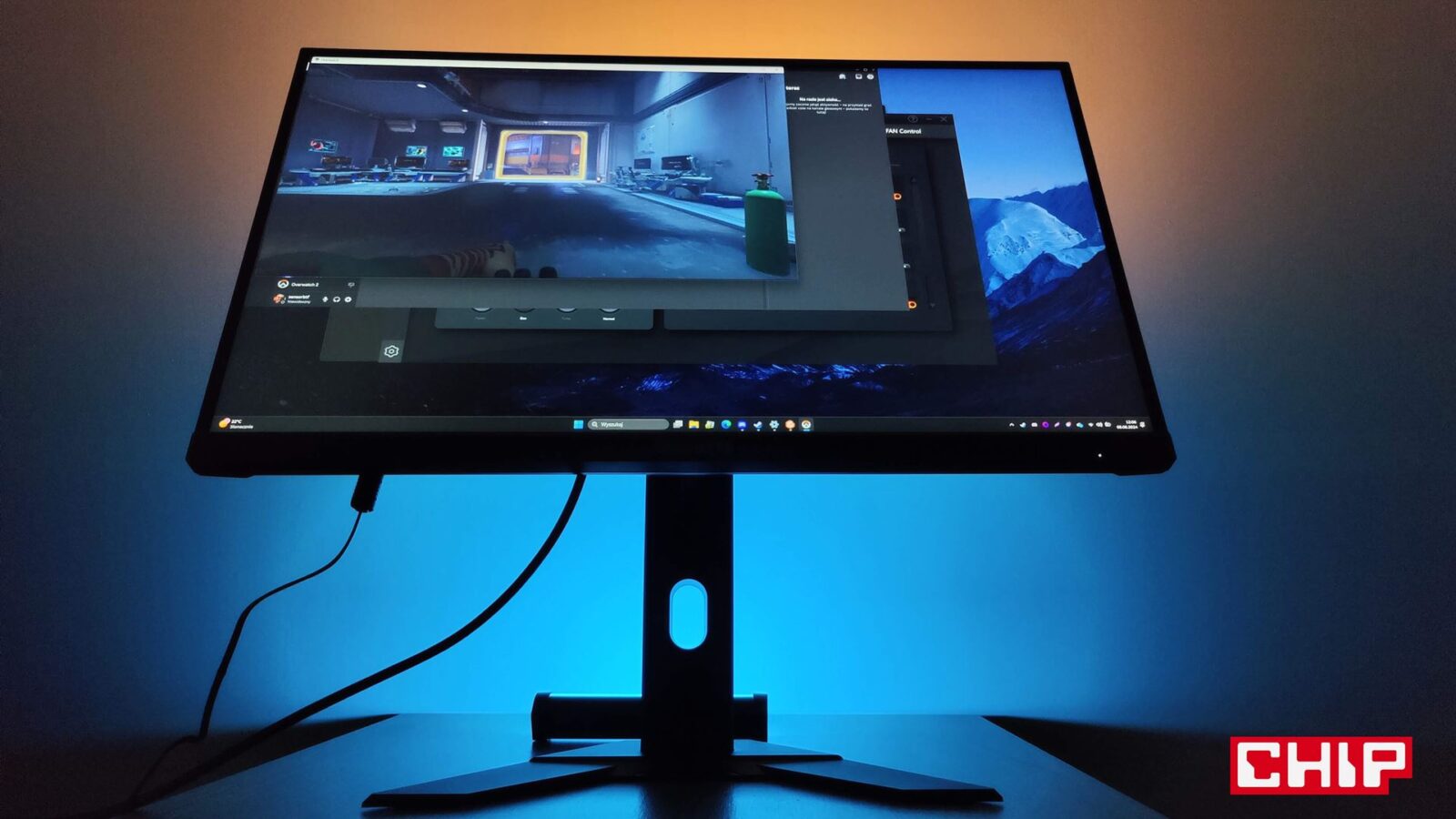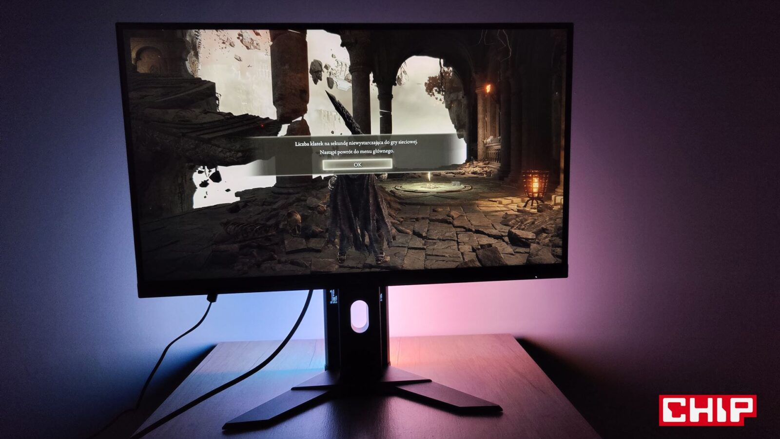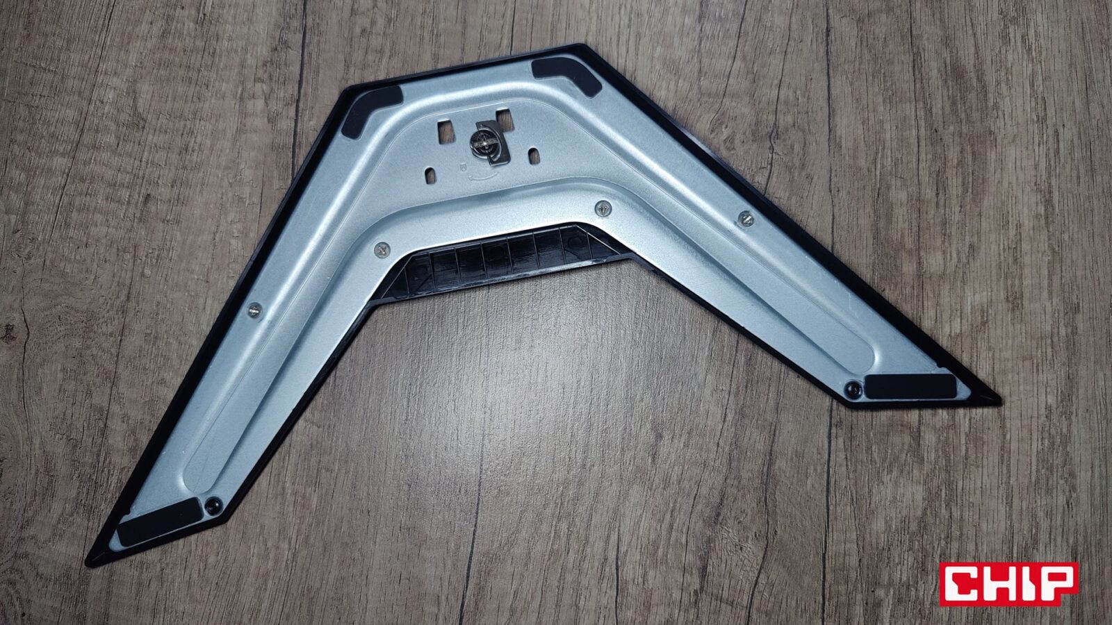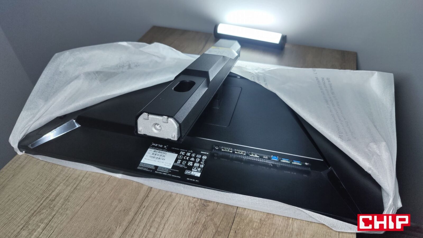 Wyposażenie obejmuje bowiem zasilacz, długi przewód zasilający, HDMI, DisplayPort i USB typu B do typu A, a dodatkowo tradycyjną papierologię. Spokojnie jednak – proces podłączania monitora jest banalny – wystarczy tylko wpiąć zasilanie oraz przynajmniej jeden przewód sygnałowy i można już grać. Zwłaszcza że dołączona w zestawie podstawa trójkątna oferuje regulacje wysokości do aż 130 mm, co w połączeniu z opcją dostosowania wychylenia (od -5 do +20 stopni) umożliwi ergonomiczne ustawienie ekranu na części stanowisk.