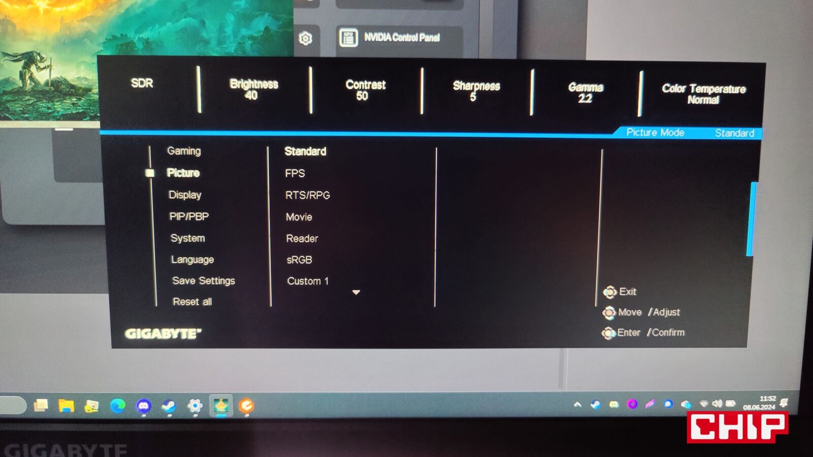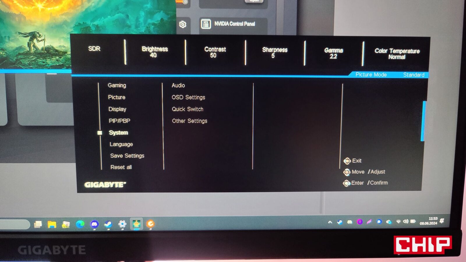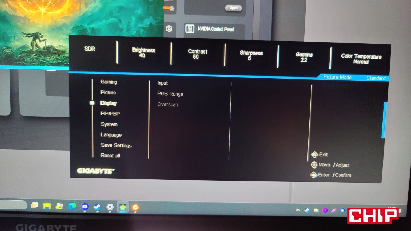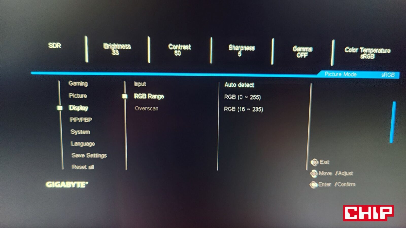 - “Oszukanej” 10-bitowej głębi kolorów w formie połączenia 8-bitowej głębi z techniką Frame Rate Control (FRC), która w ogólnym rozrachunku poprawia głębię kolorów, ale nie tak bardzo, jak standardowa 10-bitowa matryca. Innymi słowy, nawet nie szukajcie opcji przełączenia Gigabyte M27Q X z 8-bitowej na 10-bitową głębię w Windowsie