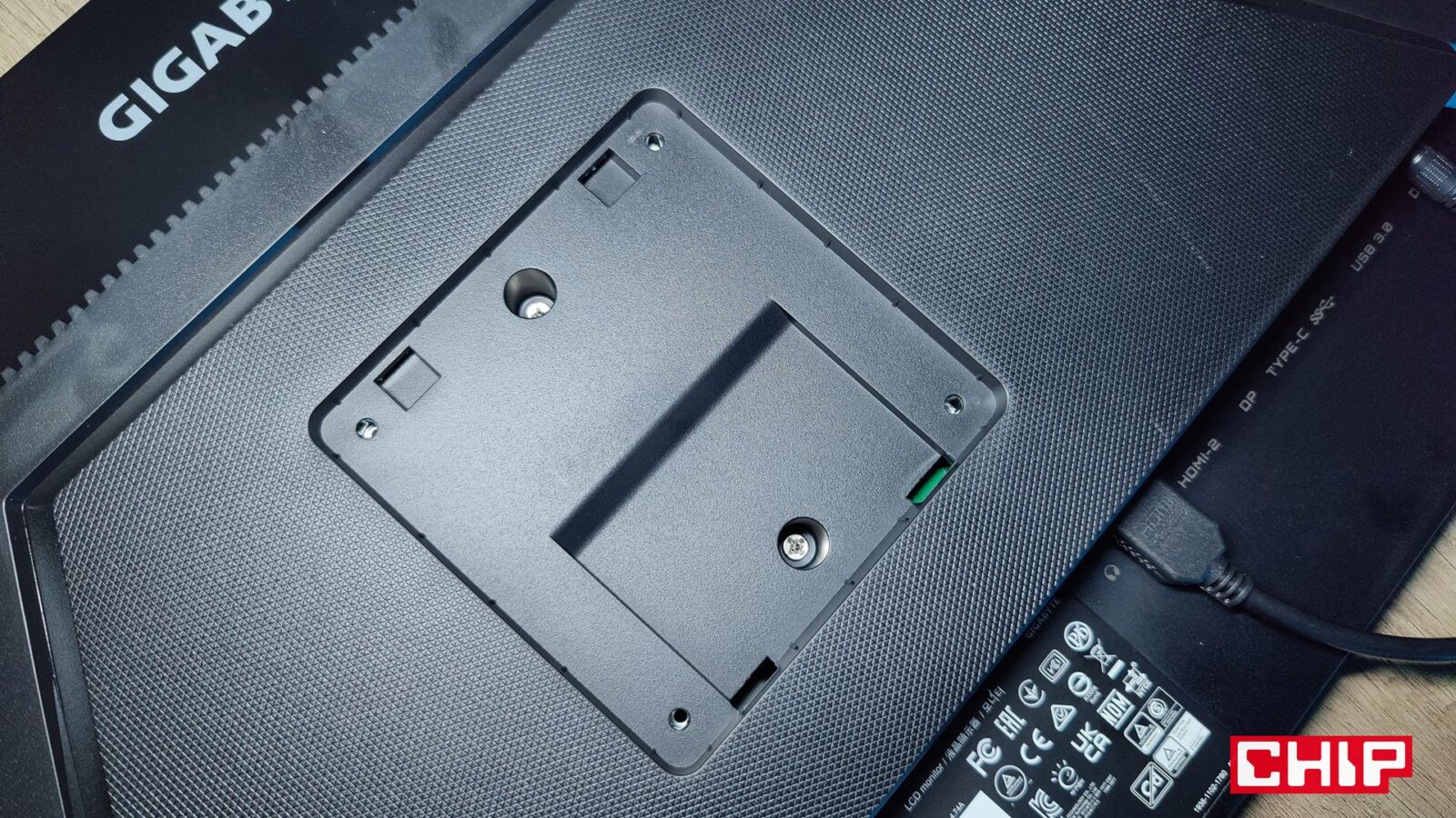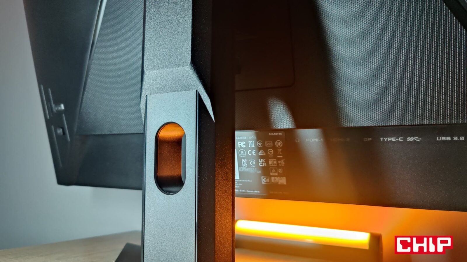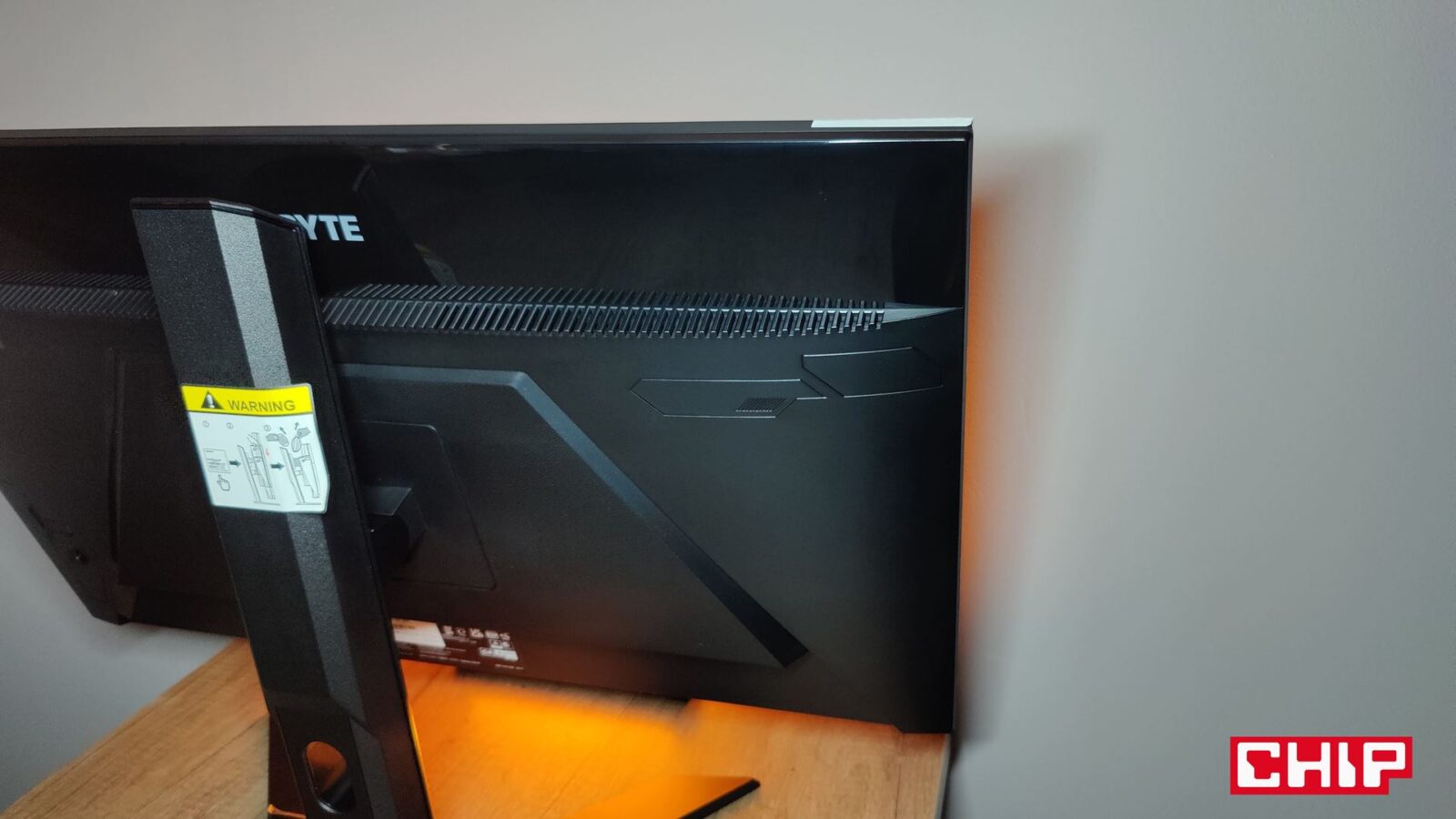 Projekt monitora Gigabyte M27Q X można uznać za dobrze przemyślany. Ciekawe plecki doczekały się dwuczęściowej obudowy (matowy plastik w dolnej i błyszczący w górnej części), wielkich otworów wentylacyjnych, przycisku do przełączania się między dwoma podłączonymi sprzętami i 4-kierunkowego przycisku funkcyjnego w prawym dolnym rogu.