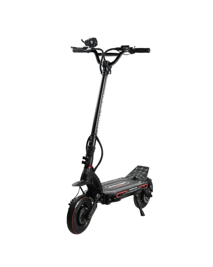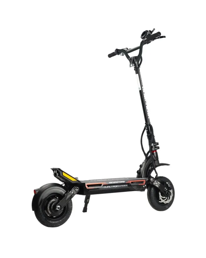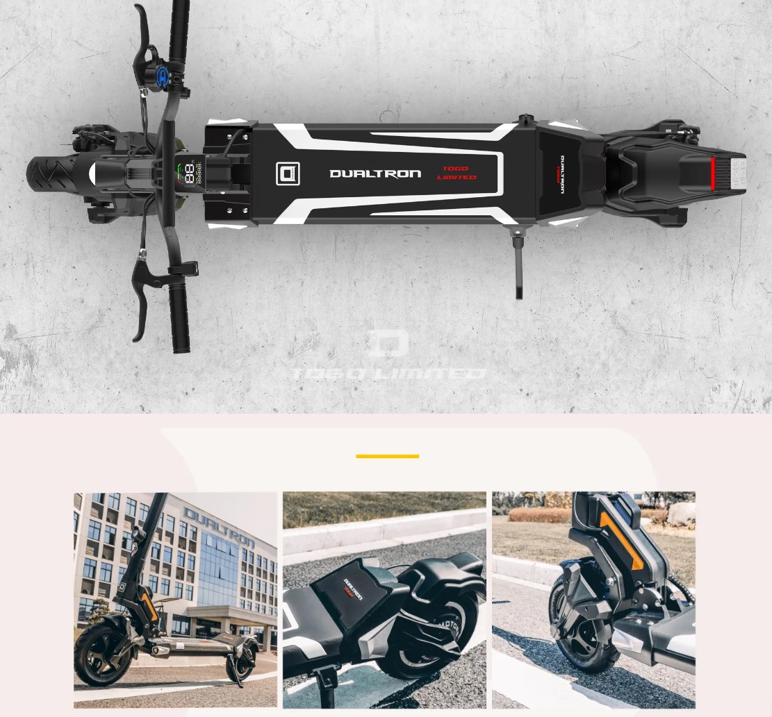 Równie ciekawą hulajnogą elektryczną jest Dualtron Togo z kierownicą wyciągniętą rodem z BMX’a. Ten sprzęt może już zachwycić napędem, jako że łączy silnik o nominalnej mocy 1000 watów z 90-Wh akumulatorem z ogniwami LG 21700, który pozwala przejechać do 65 km na jednym ładowaniu i rozpędzić się do 52 km/h po zniesieniu prawnie wymuszonego ograniczenia do 20 km/h. Taka potęga nadaje dodatkowy sens dwóm hamulcom tarczowym, ale też 10-calowym oponom o szerokości trzech cali, które tłumią dodatkowo to, czego nie udało się pochłonąć dwóm sprężynowym amortyzatorom. Wisienką na torcie tego modelu jest rozbudowany, szeroki podest, zaawansowane oświetlenie oraz możliwość złożenia go w podobny sposób, jak Motus PRO10 2022.