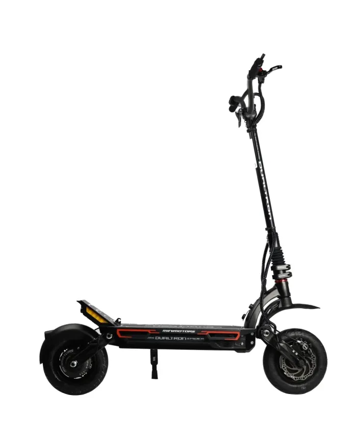 Motus PRO10 Sport Daytona to jednak nie jedyna hulajnoga elektryczna z najwyższej półki i ważący 26,2 kg Dualtron Spider II z elastomerowym zawieszeniem jest tego świetnym przykładem. Dwa silniki o mocy nominalnej rzędu 1100 watów każdy, możliwość rozpędzenia się do maksymalnie 60 km/h i akumulator o pojemności 1,8 kWh, który zapewnia zasięg do 100 km na jednym tylko ładowaniu – oto połączenie, które sprawia, że na tej hulajnodze będziecie panami szos. Zwłaszcza że obawy co do skutecznego hamowania rozwiewa obecność dwóch nie mechanicznych, a hydraulicznych hamulców z 140-mm tarczami i choć z pozoru może się to wydawać małym ulepszeniem, to uwierzcie mi, że to znaczące ulepszenie. Raz zjeżdżałem z górskiego szczytu na rowerze i hamulce mechaniczne zaczęły mi szwankować z racji linki między szczękami a manetkami, więc coś o tym wiem.
