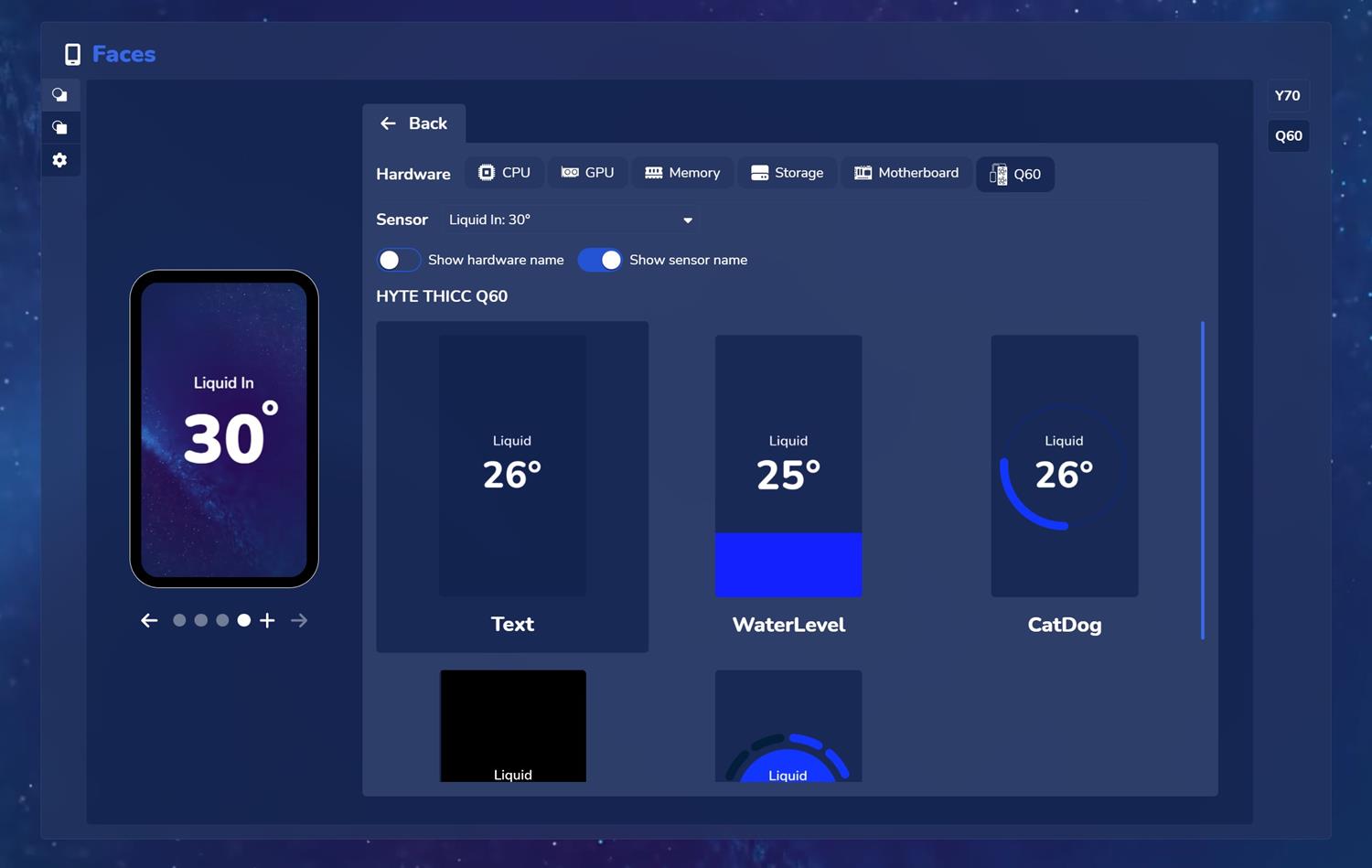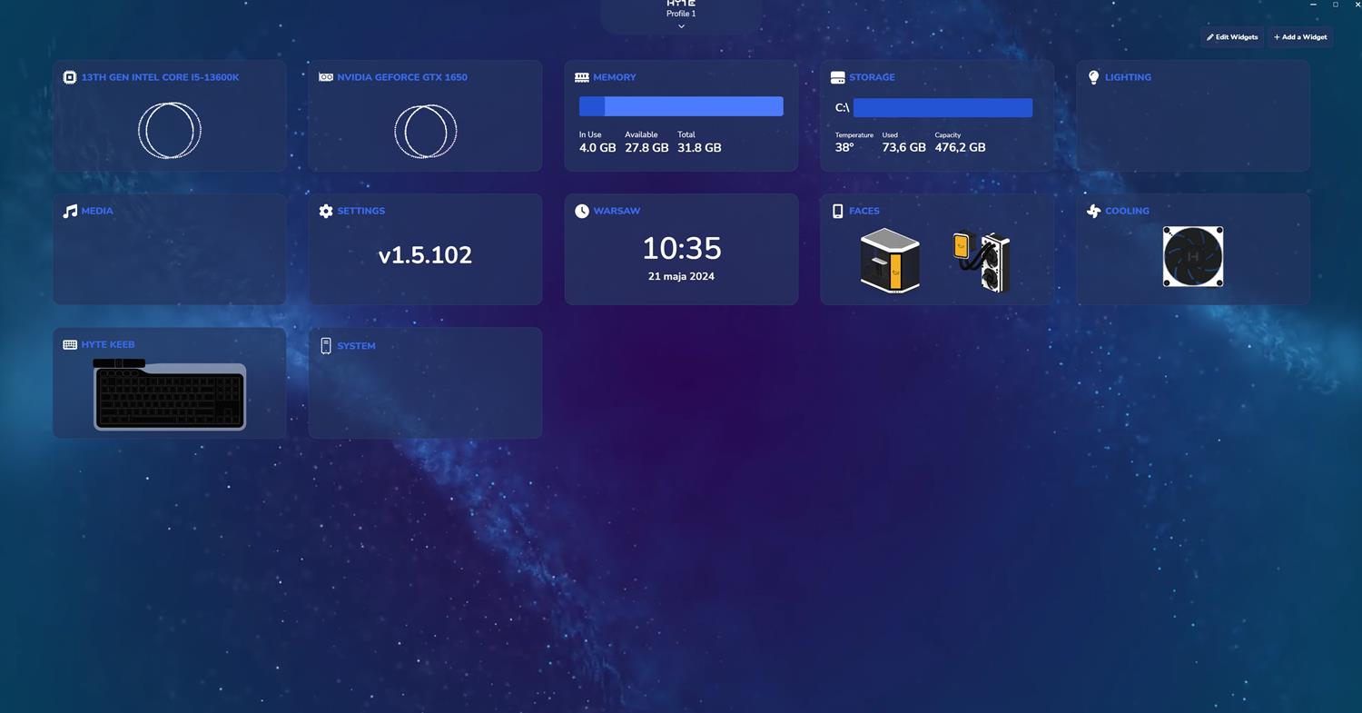 Oprogramowanie nazywa się Nexus i możecie je kojarzyć z testy obudowy Hyte Y70 Touch. Oczywiście jest ono znacznie bardziej dopracowane i teraz nie ma już problemów takich, jakie mieliśmy wcześniej. W zasadzie nie było żadnych problemów. To co głównie nas interesuje to zakładki Faces i Cooling. W tej pierwszej możecie sterować wyświetlaczem. Opcji jest bardzo dużo i możecie również ustawić kilka predefiniowanych trybów, które łatwo przełączycie. Możecie wyświetlać godzinę, temperatury, pogodę, dowolne zdjęcia i wiele innych. Dzięki temu bez problemów dopasujecie wyświetlacz do własnych wymagań. Całość jest też prosta, intuicyjna i naprawdę ładnie wygląda.