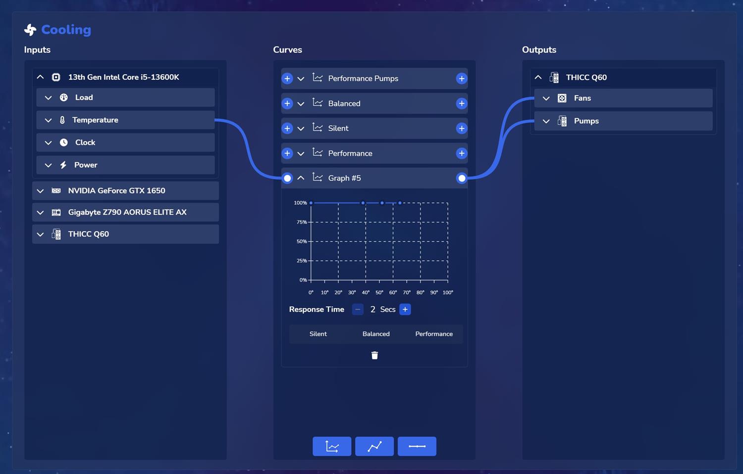 W Cooling sterujecie wentylatorami i pompkami. Rozwiązanie do sterowania jest nietypowe, ale po prostu świetnie sprawdza się w praktyce. Po lewej macie źródło temperatury. Na środku ustawiacie krzywe, których możecie mieć mnóstwo, a po prawej czy to ustawienie ma sterować prędkością wentylatorów czy pompek. Wszystko wystarczy połączyć liniami i gotowe. W każdym momencie można to też szybko zmienić. Naprawdę jest to bardzo łatwe w obsłudze rozwiązanie i działa bez problemów.