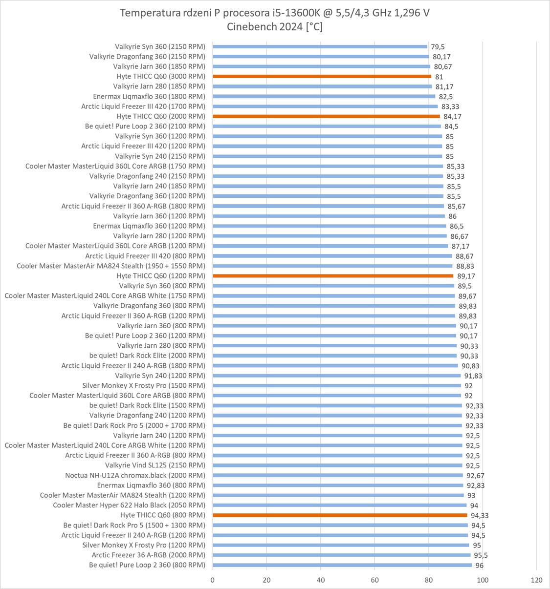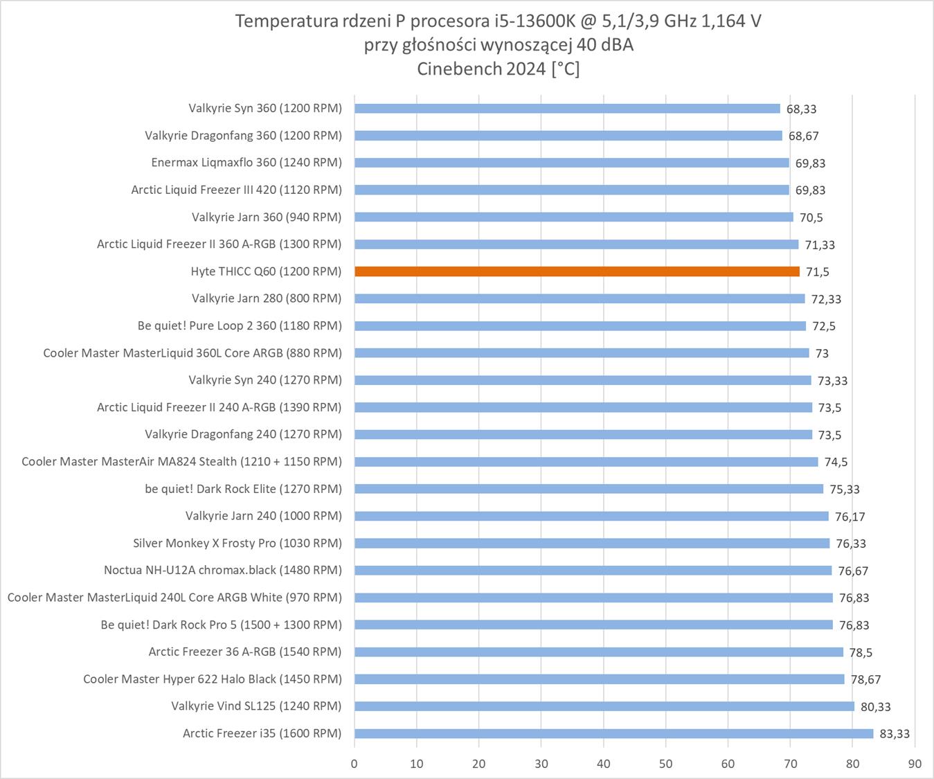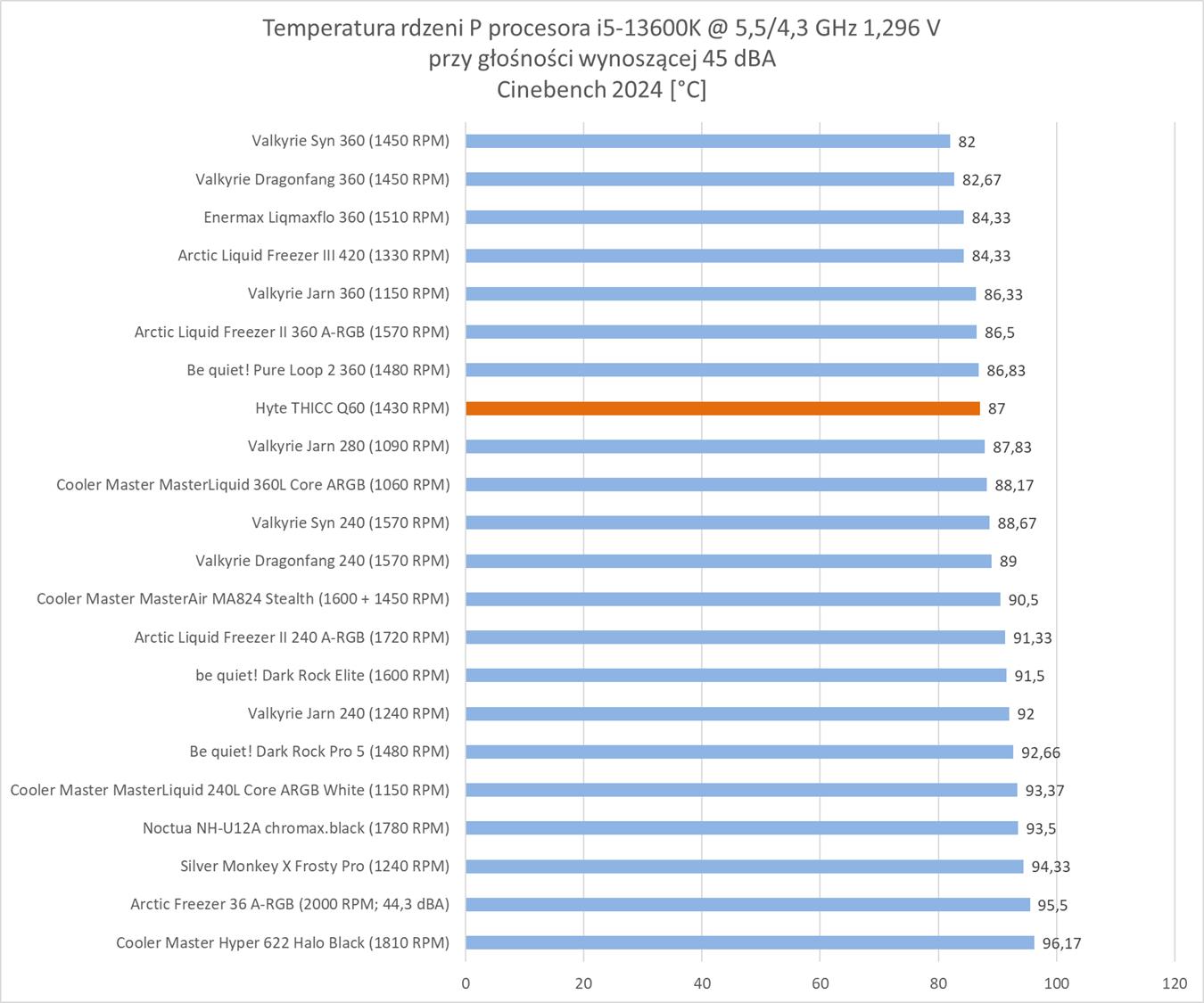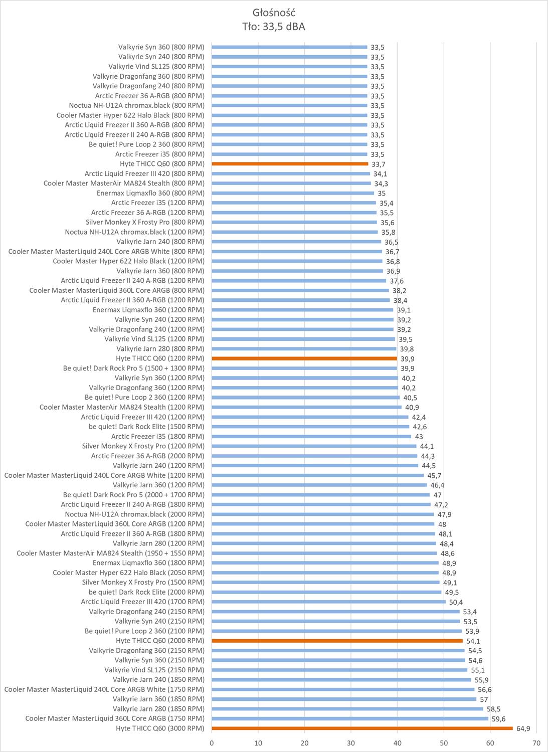 Normalizacja do 40 dBA to nadal bardzo dobre wyniki, ale już nie tak wysokie. Tutaj mamy poziom niektórych AiO 360, ale są też znacznie lepiej wypadające konstrukcje.