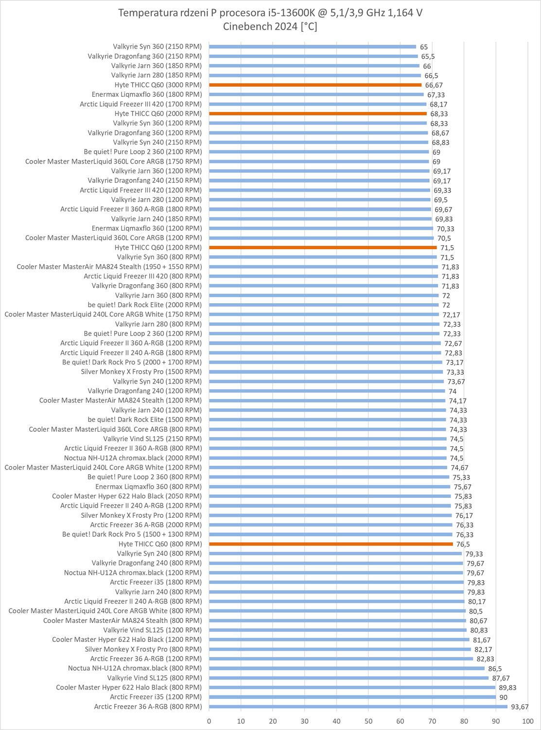 Na maksymalnych obrotach jest bardzo wydajnie. Chłodzenie z powodzeniem pokonuje nawet niektóre konstrukcje AiO 360, co jest bez wątpienia świetnym wynikiem. Naprawdę dobre rezultaty możecie też zobaczyć na pozostałych obrotach. 2000 RPM to również wyniki lepsze od niektórych AIO 360 na maks. RPM. 1200 RPM to poziom najwydajniejszego chłodzenia powietrzem w zestawieniu, a 800 RPM to również znacznie lepsze wyniki niż w przypadku standardowych AiO 240.