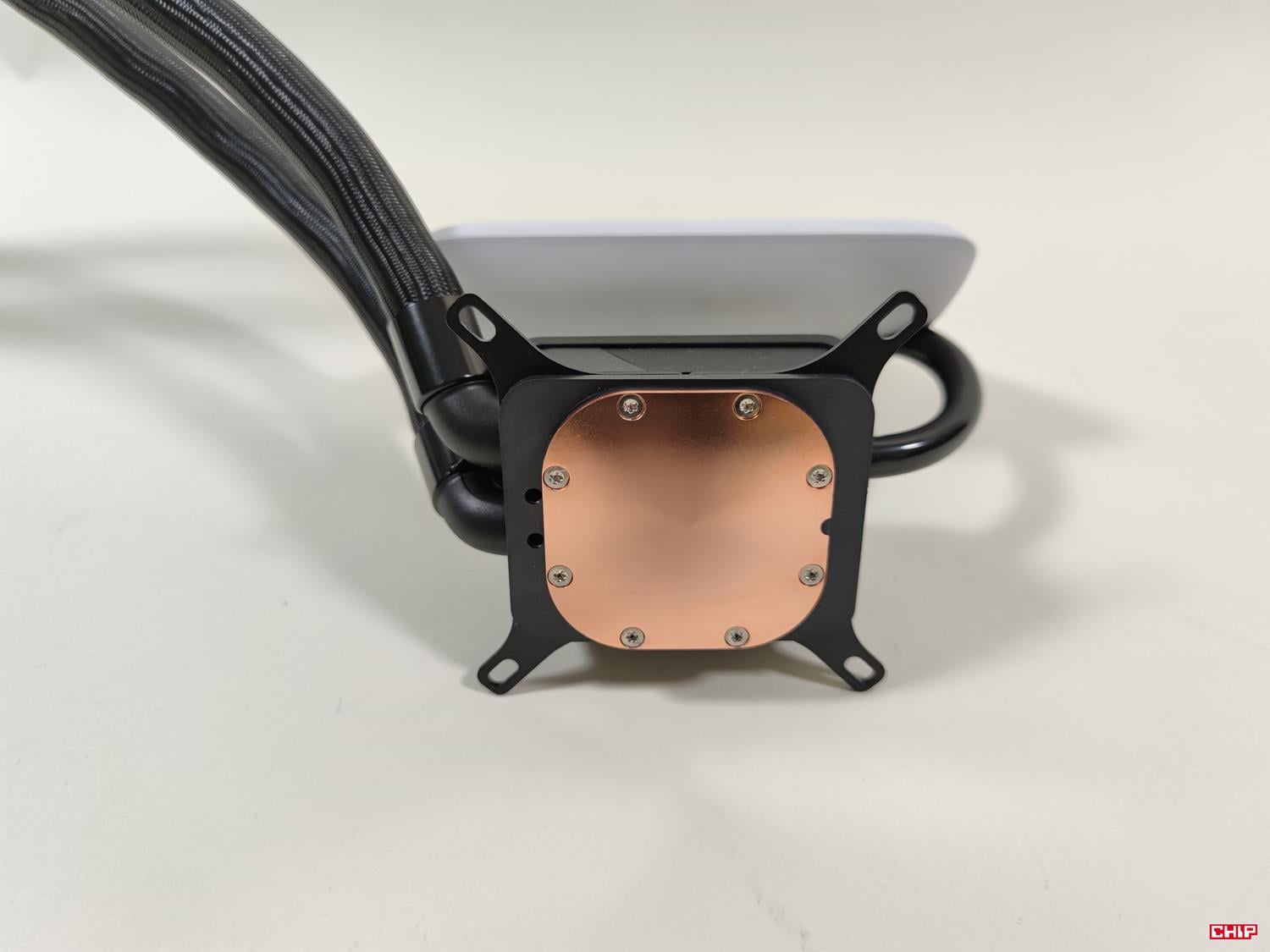 Blok ma wysokość 105 mm. Podstawka jest miedziana, ma rozmiar 56 x 56 x 1,5 mm i mamy fabrycznie nałożoną pastę. Natomiast najciekawsze znajduje się nad nim. Jest to wyświetlacz, który przypomina nam trochę smartfona. Pod nim jest podświetlenie, a samo położenie ekranu można zmieniać. Wyświetlacz ma 5 cali i rozdzielczość 720 x 1280 px. Jest to konstrukcja IPD o jasności 300 nitów oraz 60 Hz odświeżaniu. Bez wątpienia wygląda on po prostu świetnie.
