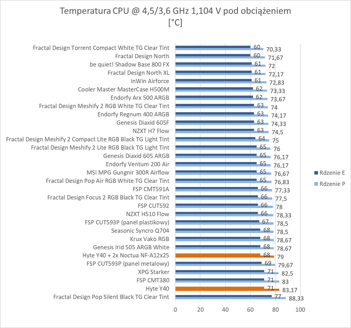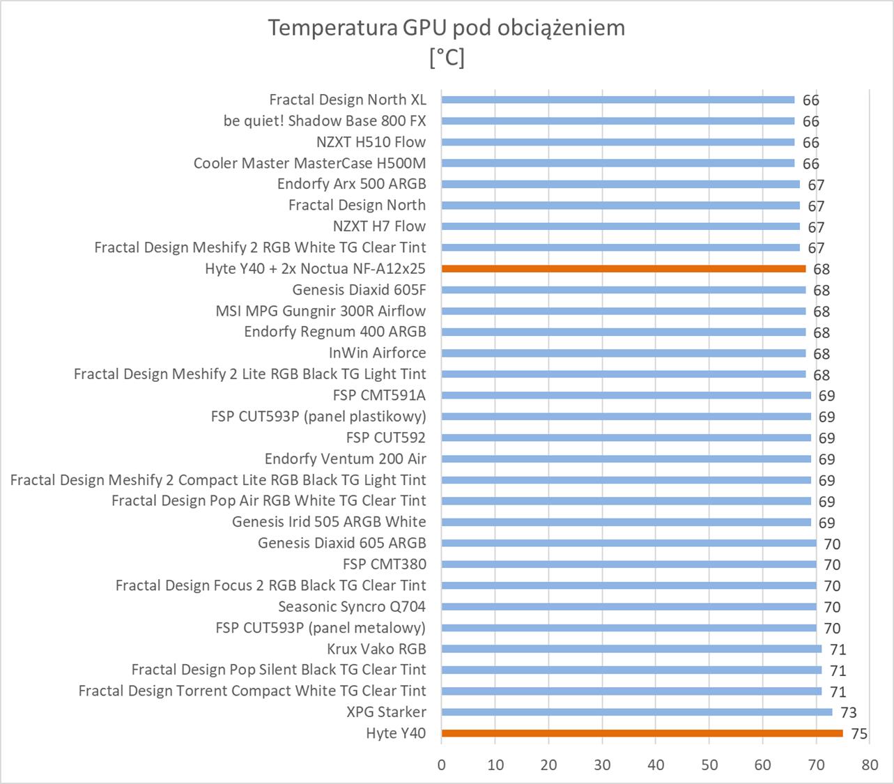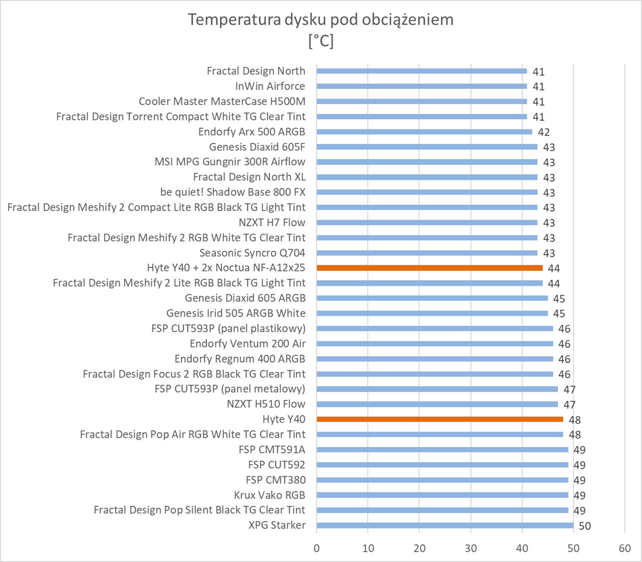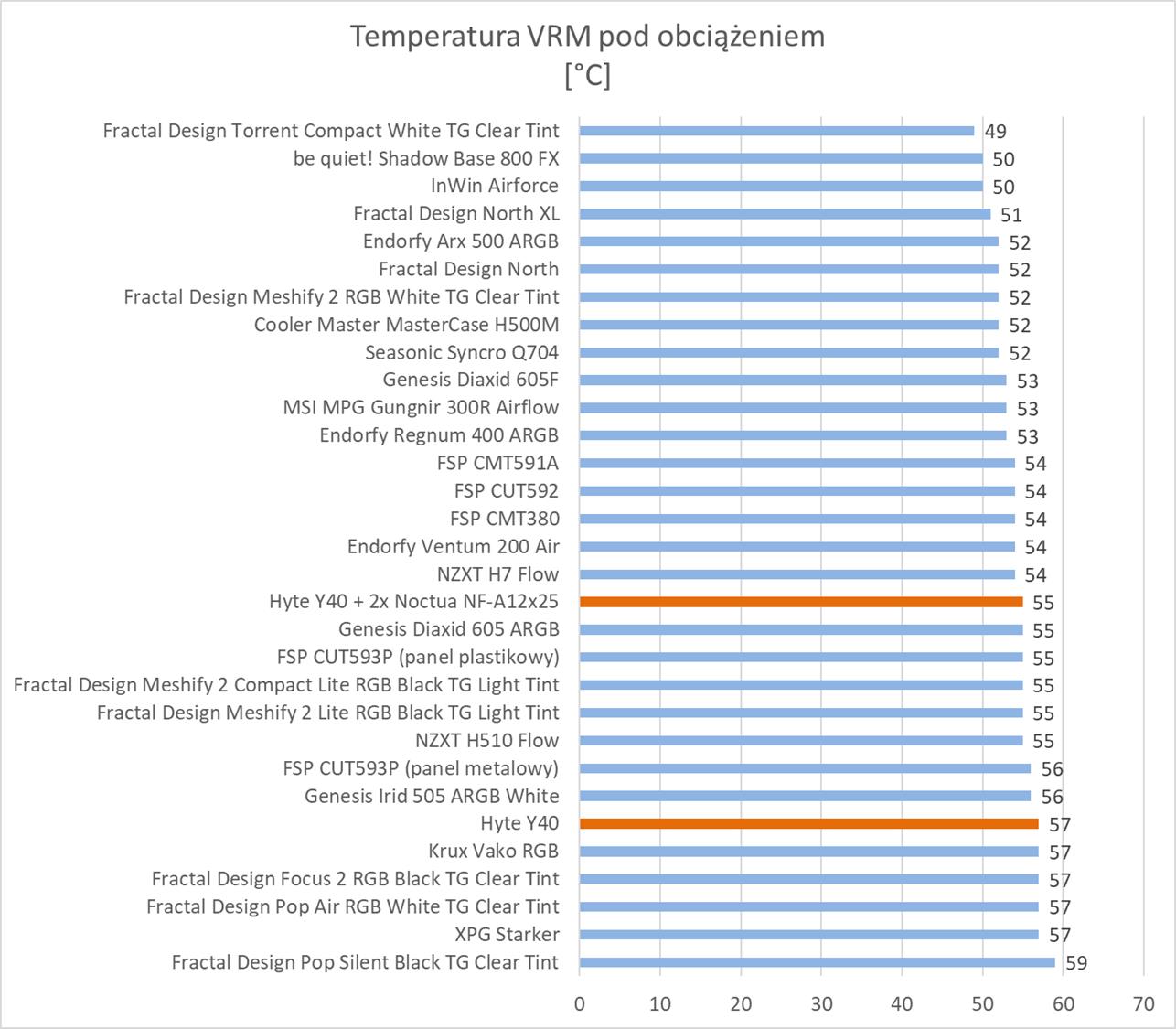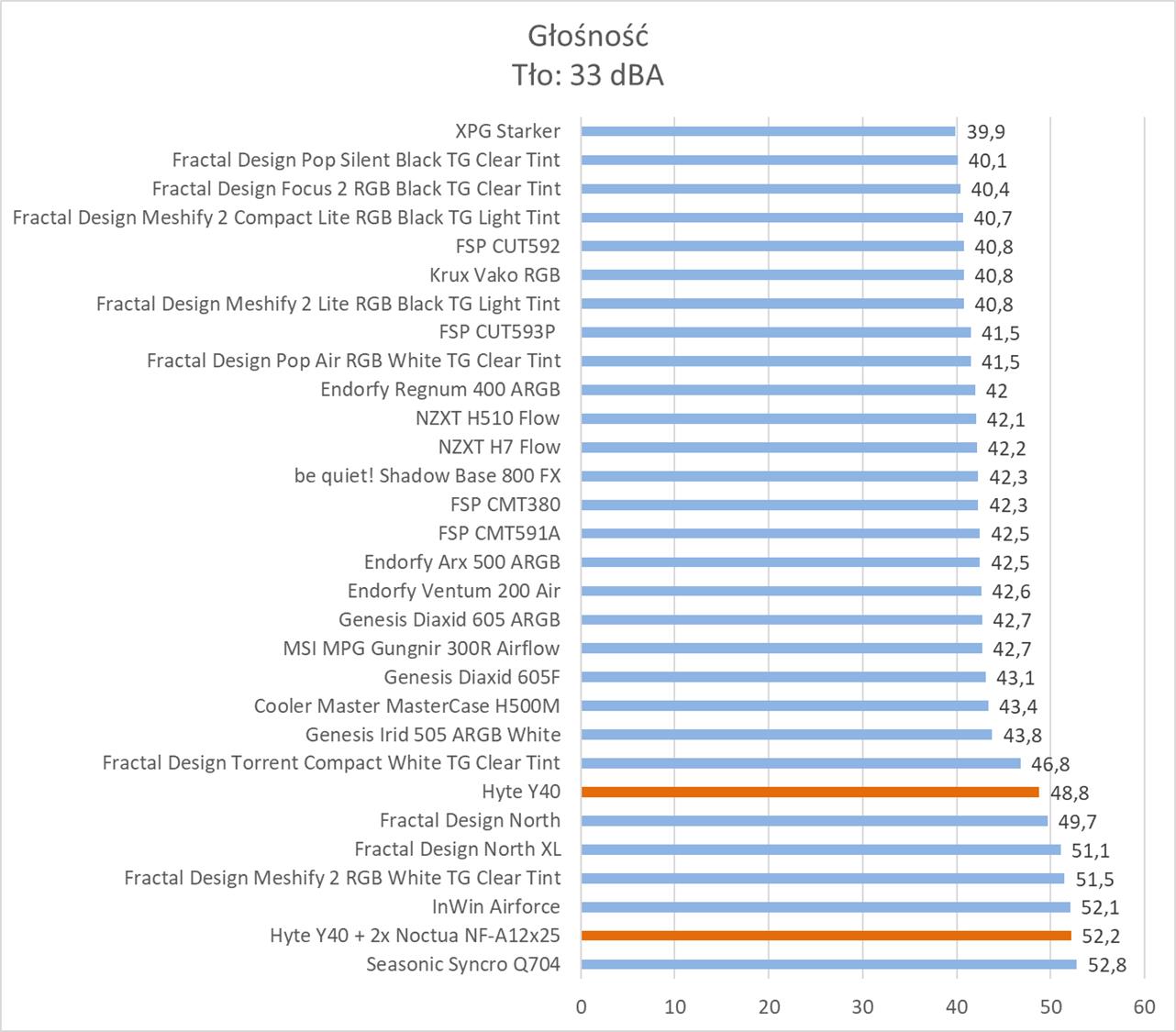 Obudowa w domyślnej konfiguracji wentylatorów nie radzi sobie zbyt dobrze. Znajduje się ona na końcówce wykresów, a temperatura karty graficznej jest najgorsza w zestawieniu. Zdecydowanie więc trzeba dołożyć wentylatory na bok. W takim przypadku jest już znacznie lepiej. Temperatura procesor może nie zmienia się mocno względem konkurencji, ale karta graficzna to już zupełni inny poziom. Spadają również temperatury dysku czy sekcji zasilania. Hyte Y40 wymaga więc dodania wentylatorów, aby podzespoły miały odpowiednie warunki do pracy.