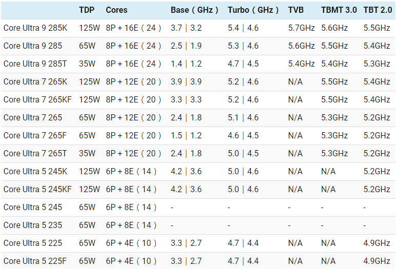 Użytkownik platformy X o nicku Jaykhin ujawnił dodatkowo ilość pamięci L3 dla poszczególnych modeli. Najwięcej, 36 MB, otrzymają Core Ultra 9 285K, Core Ultra 9 285, Core Ultra 9 285T. Na 33 MB można liczyć przy Core Ultra 7 265K, Core Ultra 7 265KF, Core Ultra 7 265, Core Ultra 7 265F oraz Core Ultra 7 265T. Będą także procesory z 24 MB pamięci L3 – Core Ultra 5 245K, Core Ultra 5 245KF, Core Ultra 5 245 i Core Ultra 5 235. Najmniej, 18 MB (czyli połowę z tego co najwydajniejsze), otrzymały Core Ultra 5 225 i Core Ultra 5 225 F.