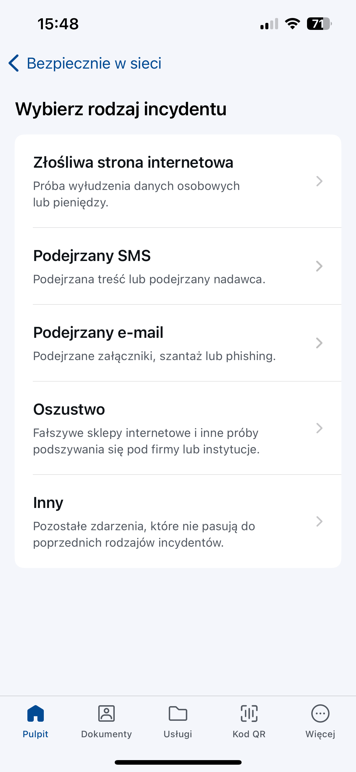 Od teraz jednak zgłosić incydent możemy wprost z mObywatela, który za rękę prowadzi poprzez całą procedurę i pozwala na anonimowe zgłoszenie. W przypadku konieczności załączenia wiadomości, maila itp mObywatel poda nam odpowiednie dane kontaktowe albo przekieruje na stronę, gdzie można kontynuować zgłoszenie.