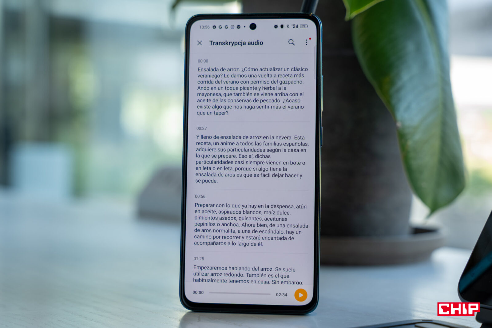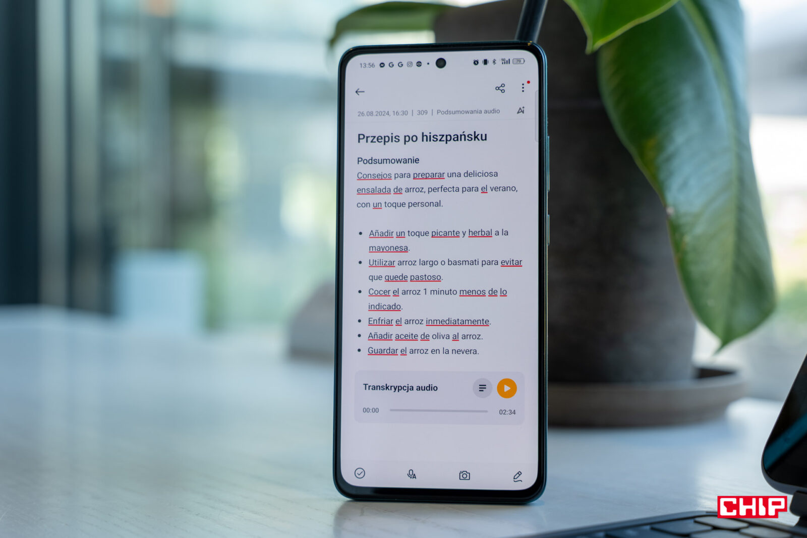Żeby przekonać się, czy ta funkcja działa dobrze, oprócz standardowego testu języka angielskiego na dyktafon nagrałem fragment artykułu po hiszpańsku. W tym miejscu warto zaznaczyć, że nie znam hiszpańskiego, a akcenty w słowach rozkładałem według odczucia. Mimo tego funkcja zarówno poprawnie streściła nagranie, gdzie czytam artykuł z hiszpańskim przepisem na sałatkę z ryżem. Mimo tego, że nie czytałem liczb, oprogramowaniu udało się zrozumieć sens. Nie odczułem dysproporcji względem transkrypcji z języka angielskiego, choć zaznaczę też, że nagrania rejestrowałem w zaciszu pomieszczenia.