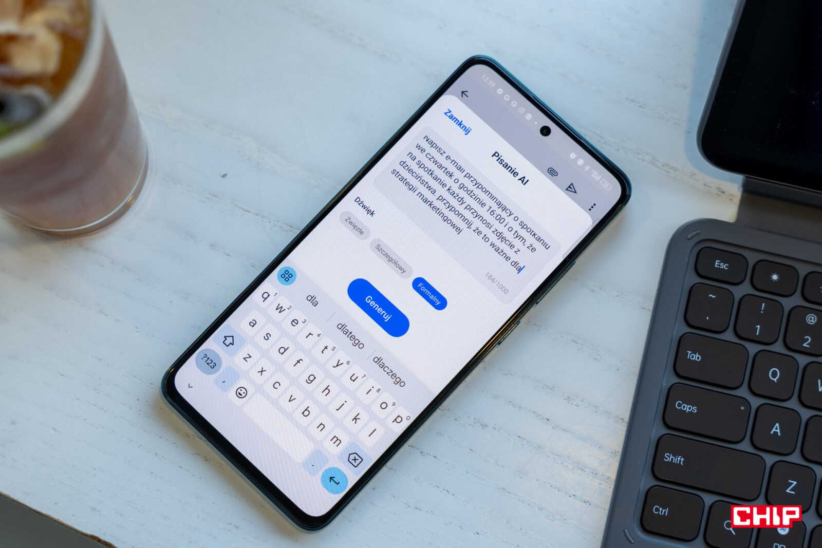 Zostając w temacie języków obcych, to OPPO Reno12 FS 5G może wam pomóc w redagowaniu wiadomości w obcych językach. Jeżeli musicie wysłać szczegółową wiadomość, która ma brzmieć poprawnie w języku, z którym nie czujecie się komfortowo, wystarczy za pomocą AI Toolbox wybrać “Pisanie AI” bazujące na modelu językowym Gemini od Google, podać mu niezbędne informacje, na bazie których ma stworzyć wiadomość i czekać. To tworzy całkiem spory zestaw funkcjonalności – od czytania do pisania.