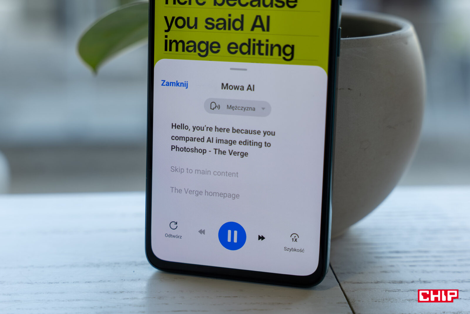 W zależności od artykułu oczekiwanie zajmie od kilkunastu do kilkudziesięciu sekund, ale streszczenie jest precyzyjne. Wiem to także dlatego, że nawet jeśli streszczamy tekst w języku, którego nie znamy, możemy skorzystać z innej funkcji na bocznym pasku, czyli “tłumaczenia ekranu”, gdzie Google Lens tłumaczy treść na język polski. Jeśli jednak macie chwilę, by włączyć rozwiązanie Mowa AI, to także jest ono warte sprawdzenia. Rozwiązanie pozwala przewijać nam tekst i przenosić się do interesujących nas akapitów. W dodatku uruchomi odczyta tekst z większą prędkością, a także nie zmusza nas, byśmy byli na stronie w trakcie czytania jej streszczenia. Wszystko dzięki małemu widżetowi, który możemy dowolnie umieszczać na ekranie, a który minimalizuję tę funkcję.