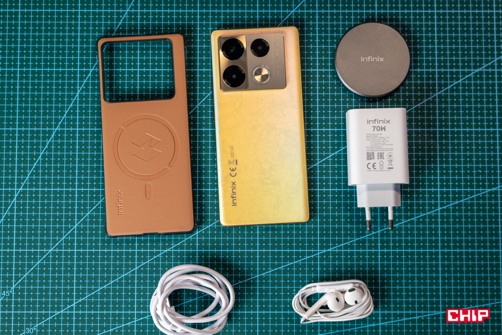 W zupełnej kontrze do tego, co przy okazji zestawów sprzedażowych robi Samsung, Infinix na start wyposażył nas w bardzo konkretny zestaw akcesoriów. Sklepowe pudełko to tak naprawdę dwa pudełka. W tym, gdzie gości smartfon, znajdziemy ładowarkę o mocy 70W oraz kabel, ale także słuchawki (na moje grające dość podstawowo, ale jednak dzięki USB-C są unikatowe i do rozmów się nadadzą) i etui. W dodatku nie jest ono byle jakie, bo poza przyjemną w dotyku ekoskórą, zawiera magnesy. Dzięki nim z Infinixem Note 40 Pro zadziałają wszystkie rozwiązania tworzone w standardzie MagSafe. W drugim pudełku producent dołączył bardzo lekką i smukłą ładowarkę bezprzewodową o mocy 15W.