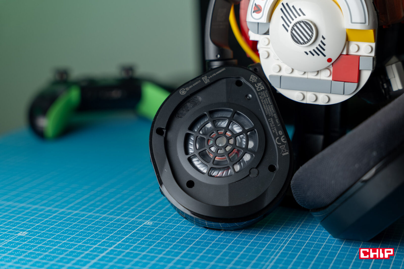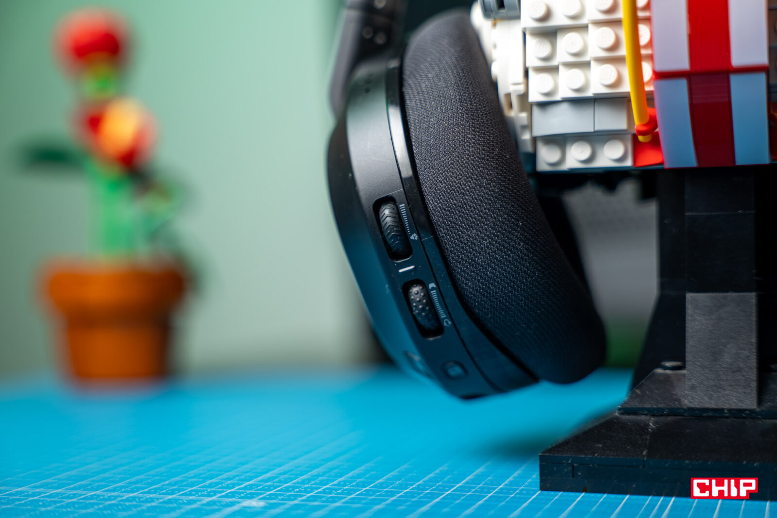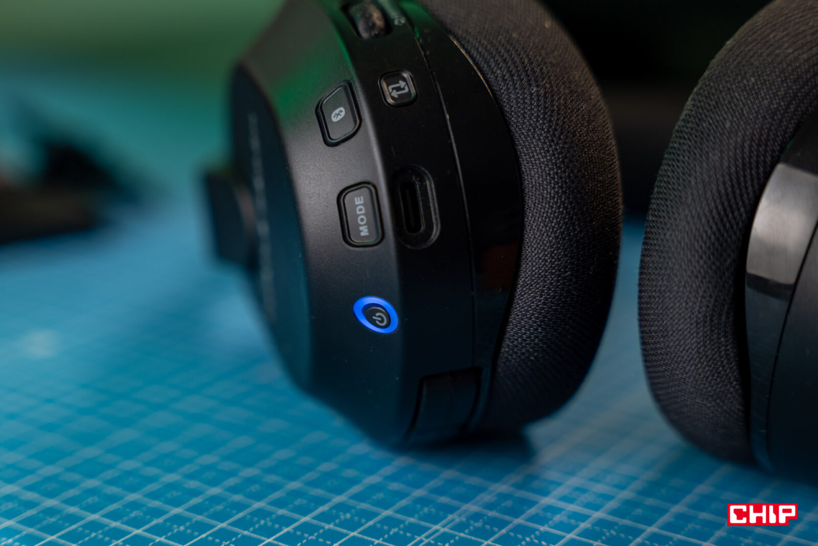 Na obudowie znajdziemy trochę przycisków. Otoczony diodami LED jest włącznik, obok którego umieszczono przycisk “Mode” pozwalający przełączać się między trybami, które skonfigurujemy w aplikacji Turtle Beach Swarm II (o tym później). Nad nim przycisk do parowania urządzeń Bluetooth. Obydwa nieco poruszają się na boki, ale mają przyjemny klik, a dzięki obramowaniu łatwiej namierzyć je palcem. Pod nimi znajduje się przełącznik między 2,4 GHz a Bluetooth, a wyżej dwa pokrętła – jedno do głośności dźwięku ze źródła, a drugie do miksowania pomiędzy głośnością rozgrywki a poziomem nasłuchu swojego głosu w mikrofonie.