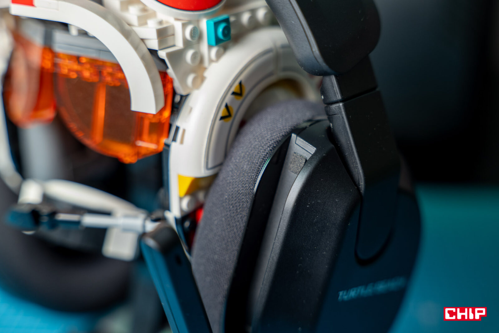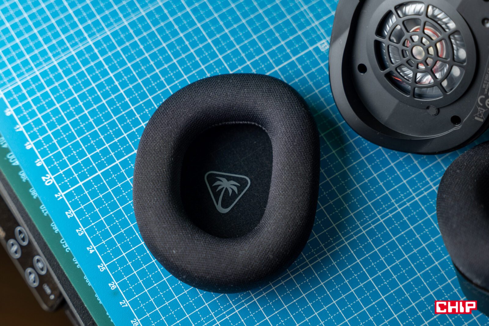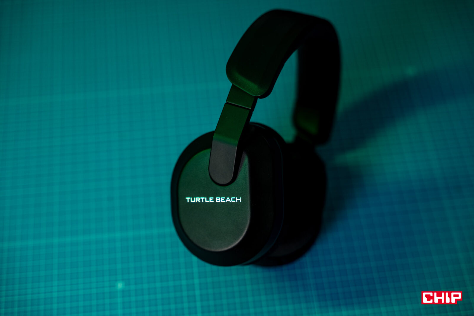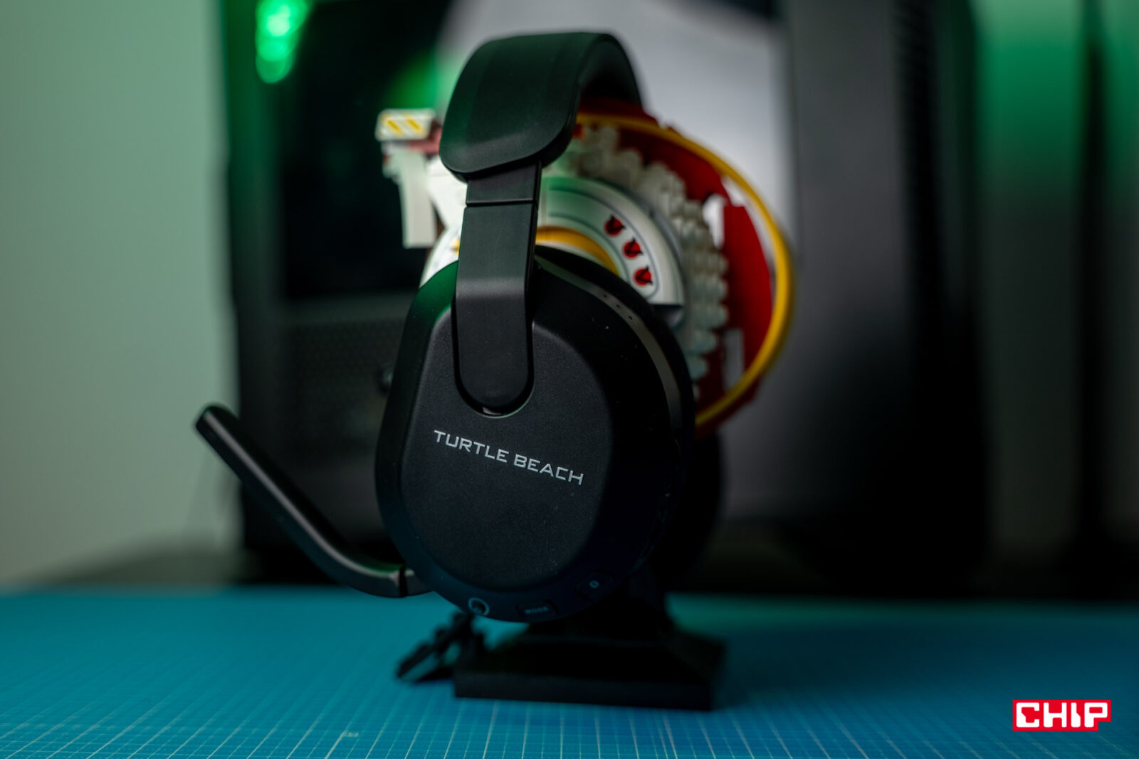 Na obudowie znajdziemy trochę przycisków. Otoczony diodami LED jest włącznik, obok którego umieszczono przycisk “Mode” pozwalający przełączać się między trybami, które skonfigurujemy w aplikacji Turtle Beach Swarm II (o tym później). Nad nim przycisk do parowania urządzeń Bluetooth. Obydwa nieco poruszają się na boki, ale mają przyjemny klik, a dzięki obramowaniu łatwiej namierzyć je palcem. Pod nimi znajduje się przełącznik między 2,4 GHz a Bluetooth, a wyżej dwa pokrętła – jedno do głośności dźwięku ze źródła, a drugie do miksowania pomiędzy głośnością rozgrywki a poziomem nasłuchu swojego głosu w mikrofonie.
