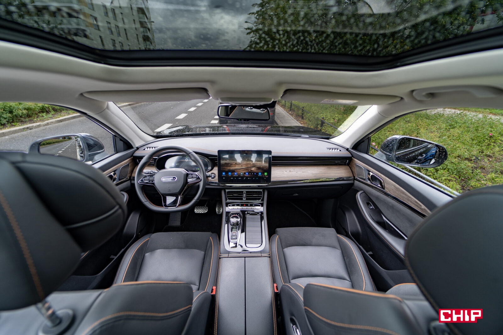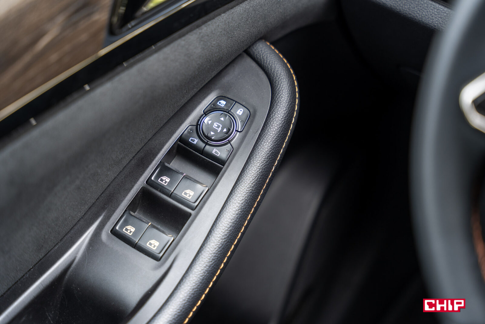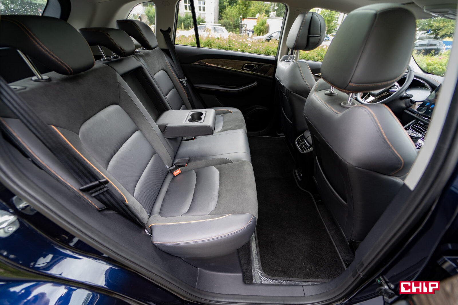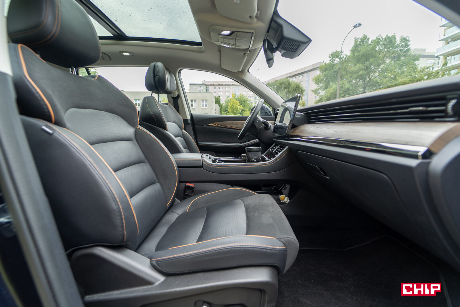 Wykonanie wnętrza jest bardzo dobre. Nawet droższe auta by się tego nie powstydziły. Dużo skóry, względnie mało piano black (na konsoli środkowej) i… drewno? Prawdę mówiąc trudno powiedzieć, czy to cienka warstwa drewna, czy jakaś drewnopodobna okleina, ale wrażenie robi bardzo pozytywne. Podobnie jak złote listwy biegnące wokół wnętrza i złoty brzmi co prawda jak ostatnia tandeta, ale to naprawdę wygląda dobrze. Poza wykonaniem na pochwałę zasługuje też bardzo dobre wyciszenie wnętrza. Kolorowe podświetlenie znajdziemy tylko w droższej wersji wyposażenia – Exclusive.