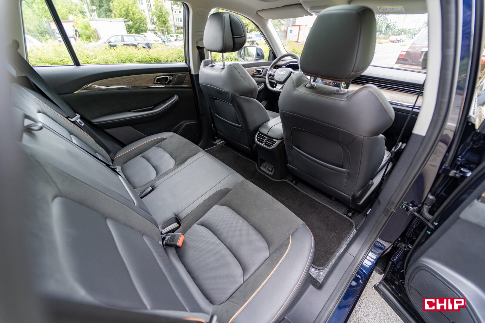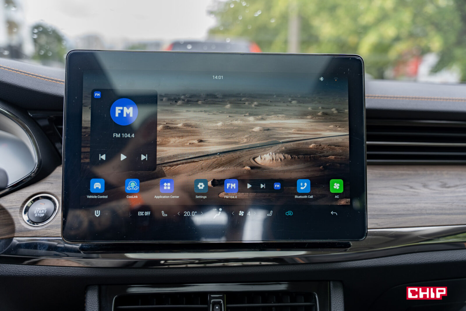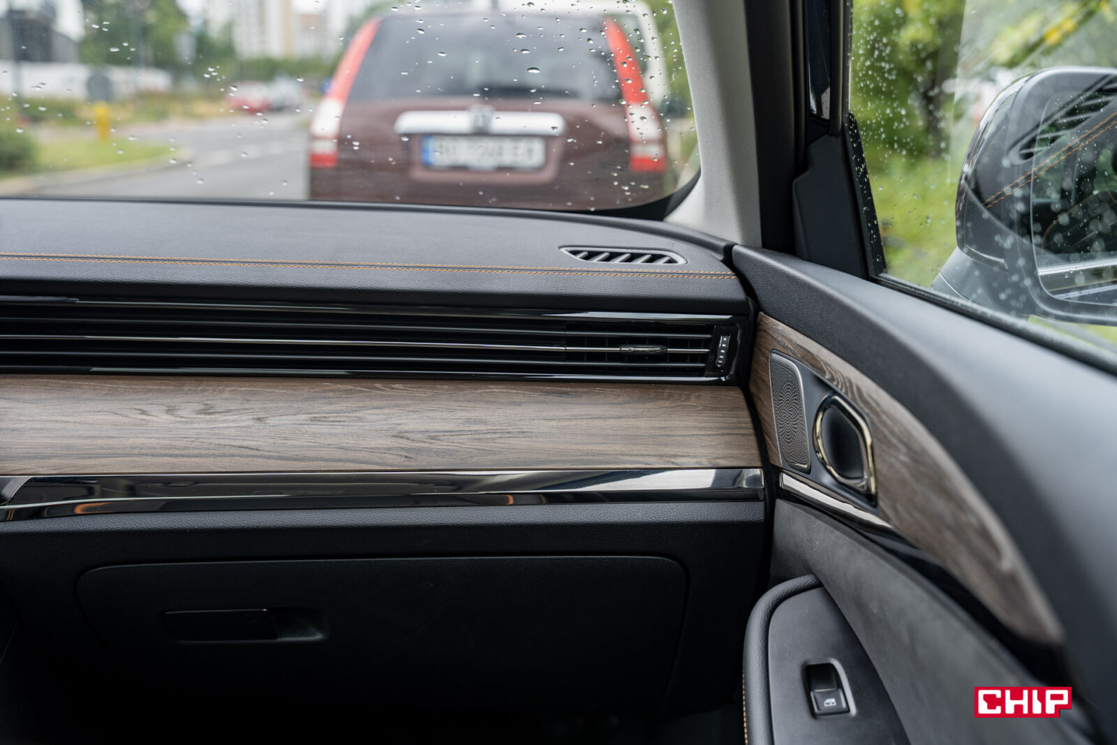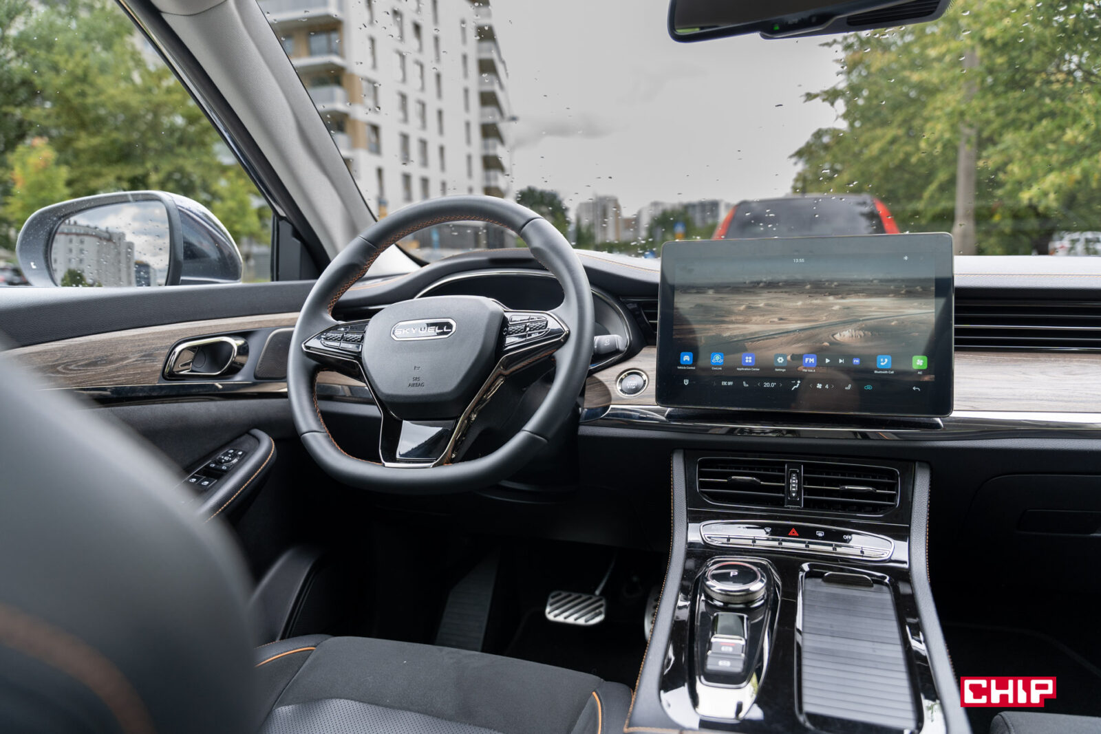 Wykonanie wnętrza jest bardzo dobre. Nawet droższe auta by się tego nie powstydziły. Dużo skóry, względnie mało piano black (na konsoli środkowej) i… drewno? Prawdę mówiąc trudno powiedzieć, czy to cienka warstwa drewna, czy jakaś drewnopodobna okleina, ale wrażenie robi bardzo pozytywne. Podobnie jak złote listwy biegnące wokół wnętrza i złoty brzmi co prawda jak ostatnia tandeta, ale to naprawdę wygląda dobrze. Poza wykonaniem na pochwałę zasługuje też bardzo dobre wyciszenie wnętrza. Kolorowe podświetlenie znajdziemy tylko w droższej wersji wyposażenia – Exclusive.