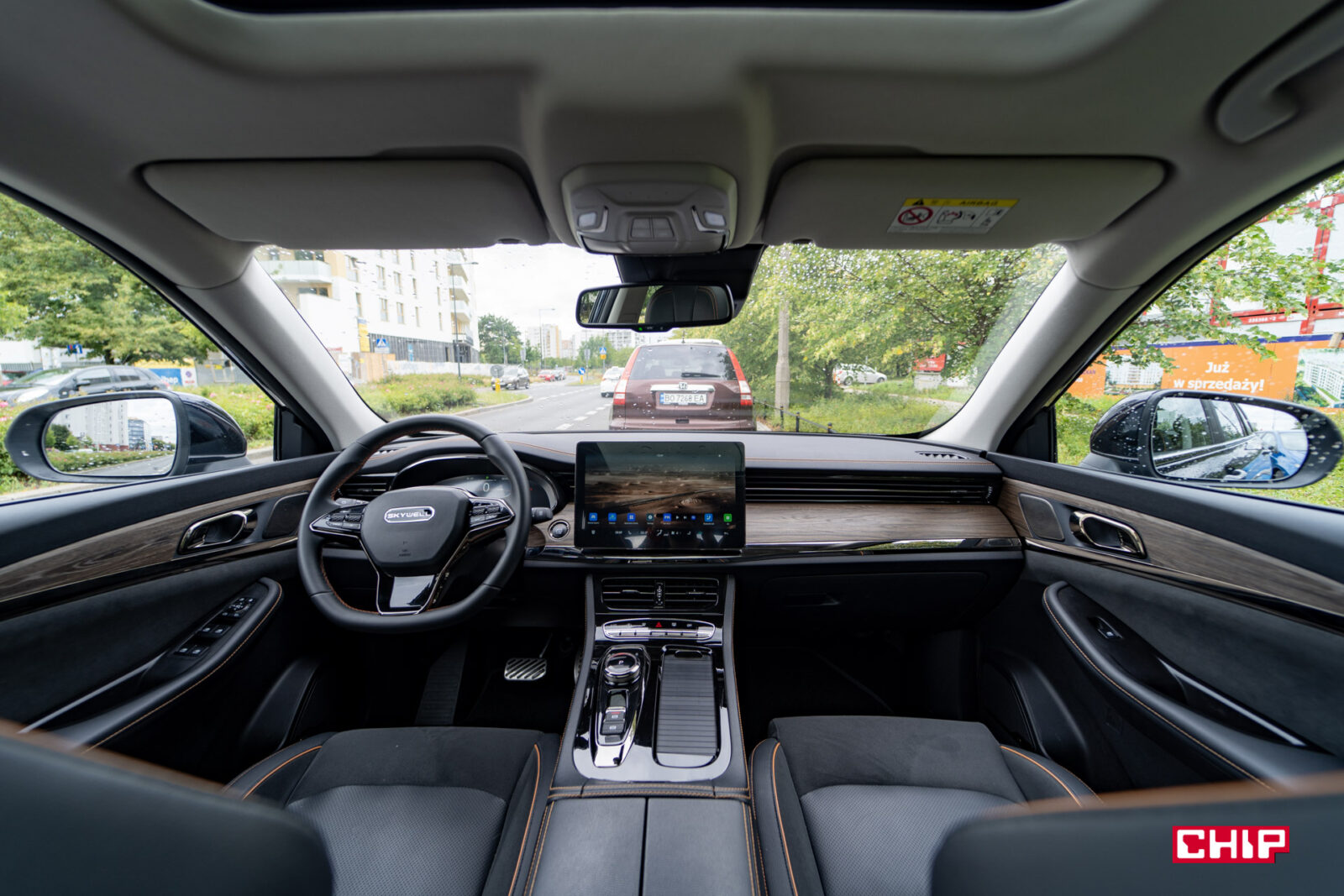 Skyworth K jest dosyć ubogi w systemy bezpieczeństwa. Ich krótka lista obejmuje ABS, rozdział siły hamowania (EBD), hamowanie pomocnicze (EBA), wspomaganie ruszania pod górę, ESP i kontrolę zjazdu. Do tego w niższej wersji wyposażenia (Legend) dostajemy pasywny tempomat, a w droższej adaptacyjny z utrzymywaniem w pasie ruchu (autonomia poziomu 2.5). A co z monitorowaniem martwego pola? Ruchu poprzecznego? Nie ma, nawet w opcji.