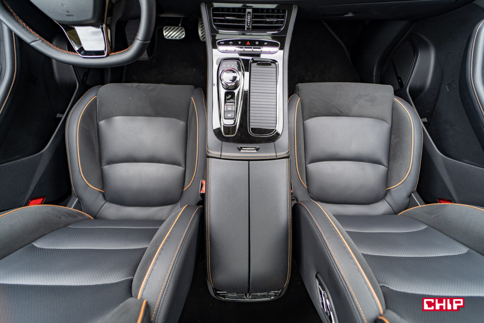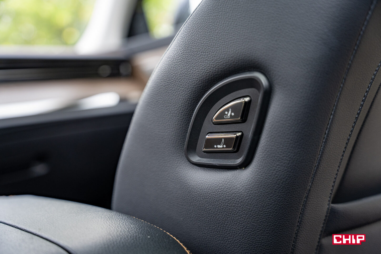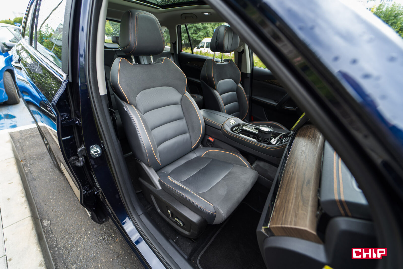 Fotele z przodu są bardzo duże i regulowane elektrycznie. Odpowiednio miękkie, wygodne i podróżuje się w nich bardzo komfortowo, choć nie każdemu będzie pasować to, że siedzi się bardzo wysoko. Z fotelami są związane dwie nietypowe funkcje. Pierwszą możecie kojarzyć z Hyundaia i tam też wygląda ona dziwnie i jest to możliwość regulowania pozycji fotela pasażera za pomocą przycisków na jego lewym boku. Czyli może to zrobić pasażer z tyłu.
