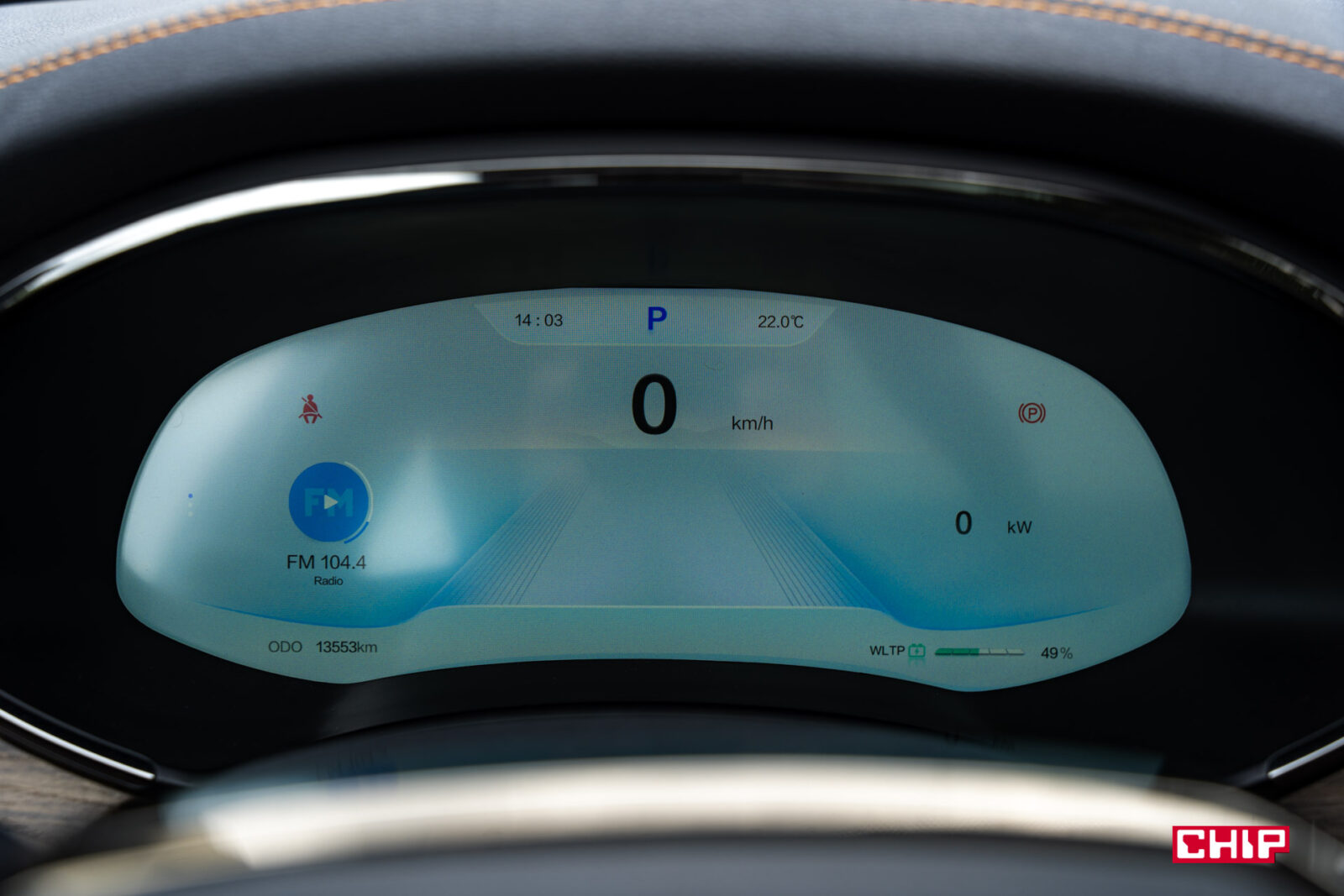 Ekran kierowcy też jest dobrej jakości i tutaj też niewiele się dzieje. Możemy zmienić motyw z jasnego na ciemny oraz wyświetlane informacje, jak np. zamienić zasięg w kilometrach na stan naładowania akumulatora.