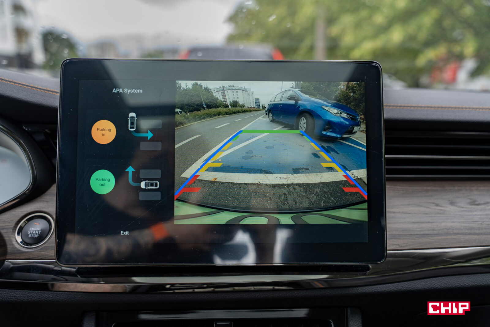 Do dyspozycji mamy kamerę cofania oraz asystenta parkowania, z opcją zdalnego wjechania w wyznaczone miejsce. Kamera jest przyzwoitej jakości, a ciekawostką są czujniki parkowania, które pokazują pozostałą odległość do przeszkody.