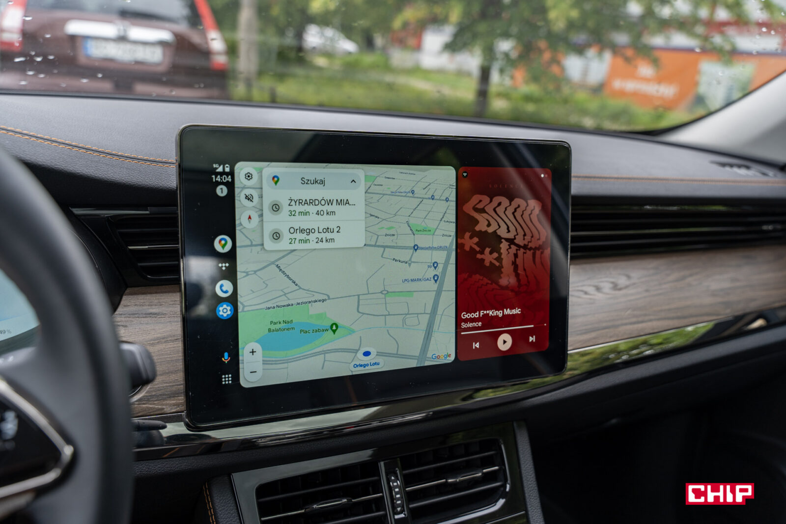 Co może niektórych zaskoczy, Skyworth K ma Android Auto (i Apple CarPlay). Co prawda obsługuje się je nietypowo, bo poprzez dodatkową aplikację i trochę naokoło, ale jest. Każdorazowo po starcie auta trzeba nawiązywać połączenie Bluetooth z poziomu smartfonu. Dodatkowo, nie wiemy z czego to wynika, każda próba użycia smartfonu zatrzymuje odtwarzaną muzykę. Może to jakaś forma zabezpieczenia?