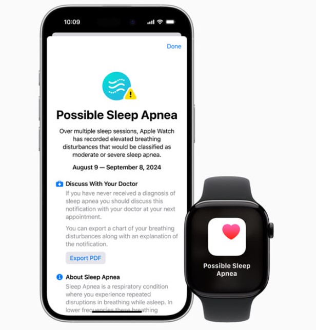 Nowy algorytm analizuje dane dotyczące zaburzeń oddychania pod kątem bezdechu sennego, umożliwiając Apple Watch powiadomienie użytkownika w przypadku wykrycia regularnych objawów tego schorzenia. Powiadomienie uwzględnia okres, w którym mogło dochodzić do bezdechu sennego, oraz informacje, jak ważne jest jego leczenie. Zawiera też trzymiesięczny raport w formacie PDF z danymi o zaburzeniach oddychania, szczegółami powiadomień oraz dodatkowymi informacjami, które mogą być pomocne podczas wywiadu lekarskiego.