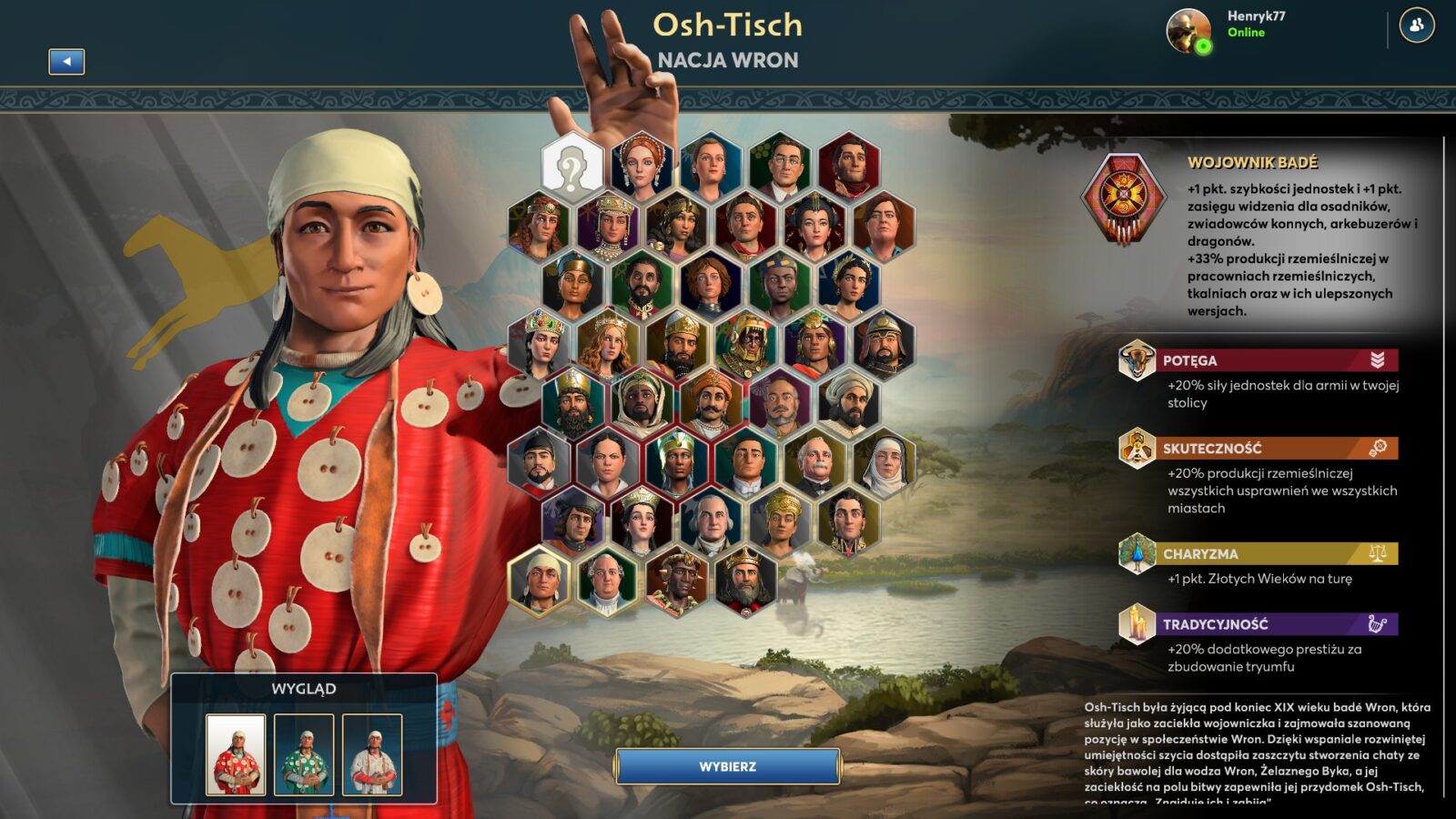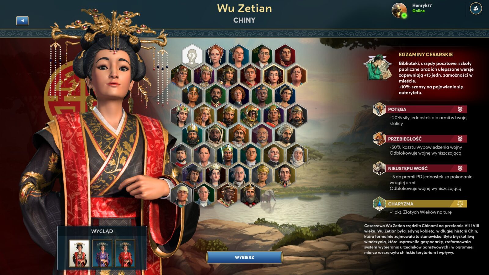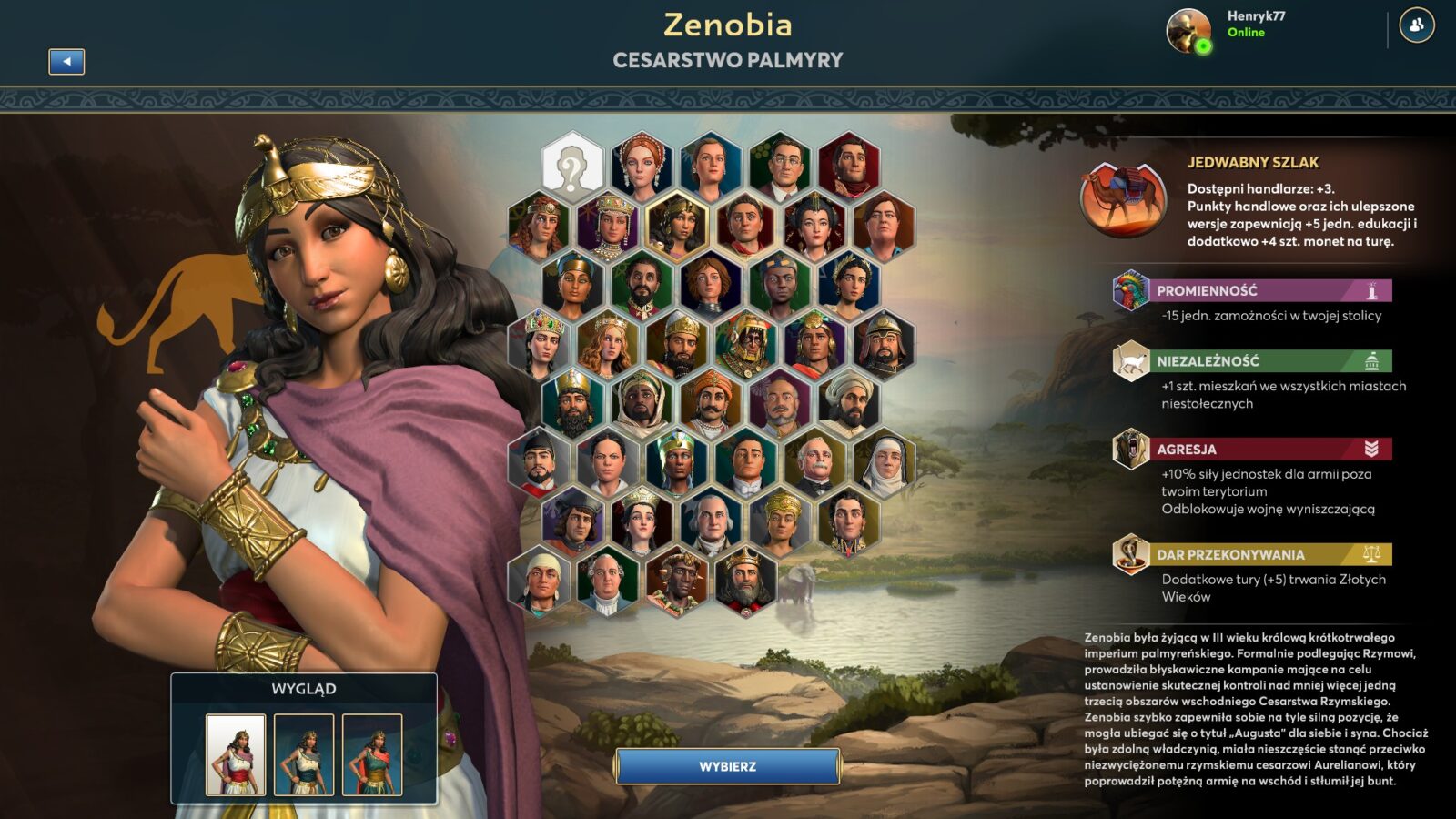 Muszę dodać, że każdy lider ma kilka outfitów – można wybrać z nich jeden. W przypadku niektórych liderów są to różne wariacje tego samego stroju, przy innych są to stroje z różnych epok. Na plus policzę, że mamy nacje z różnych okresów historii. Zrozumiała jest na przykład obecność wspomnianych Chin czy Anglii, ale mamy również Cesarstwo Bizantyjskie, Cesarstwo Palmyry, Imperium Asyryjskie, Nację Wron czy Celtów. Zabrakło mi w tym towarzystwie Sumerów lub Babilonu, ale i tak jest nieźle.