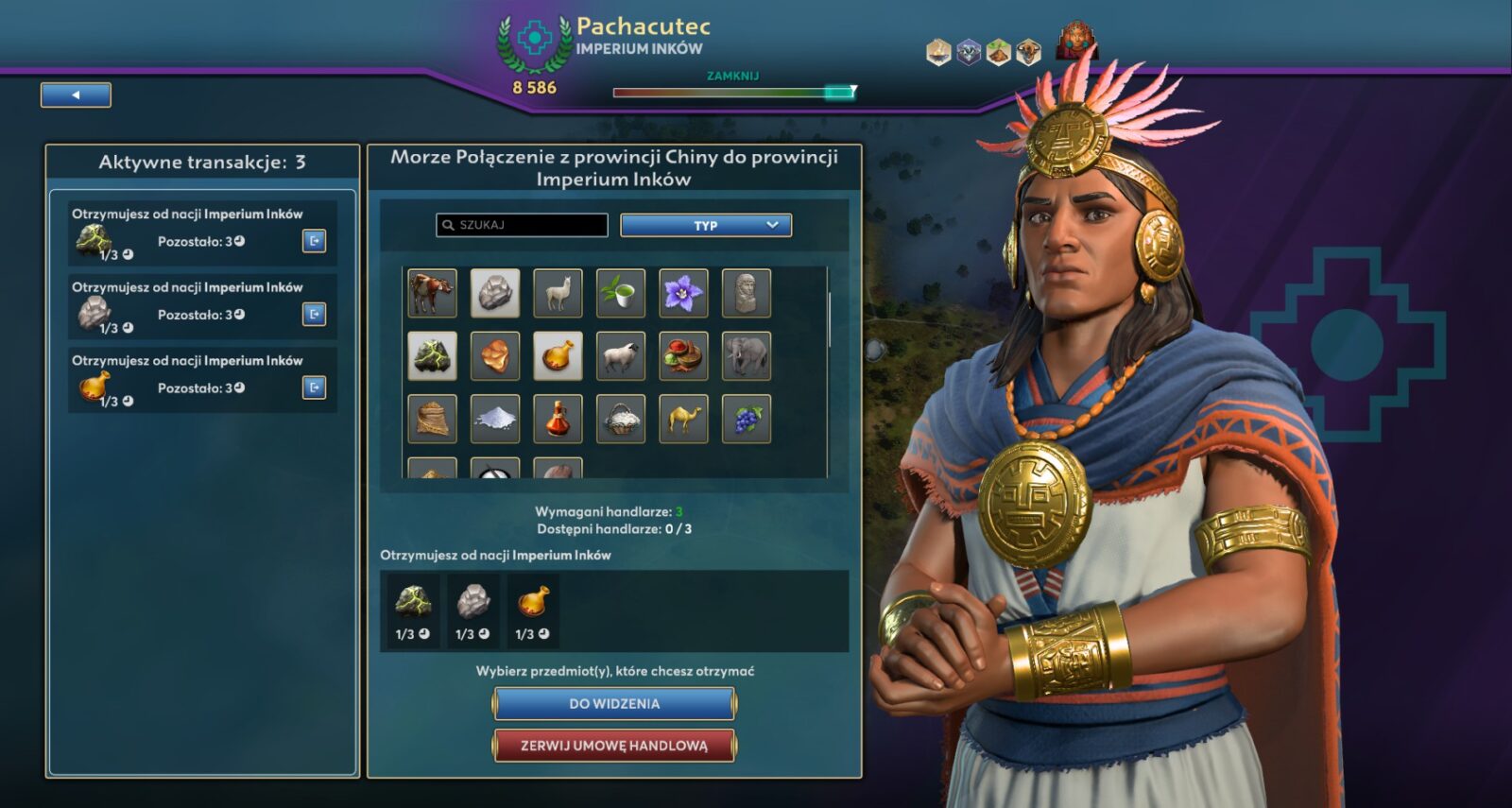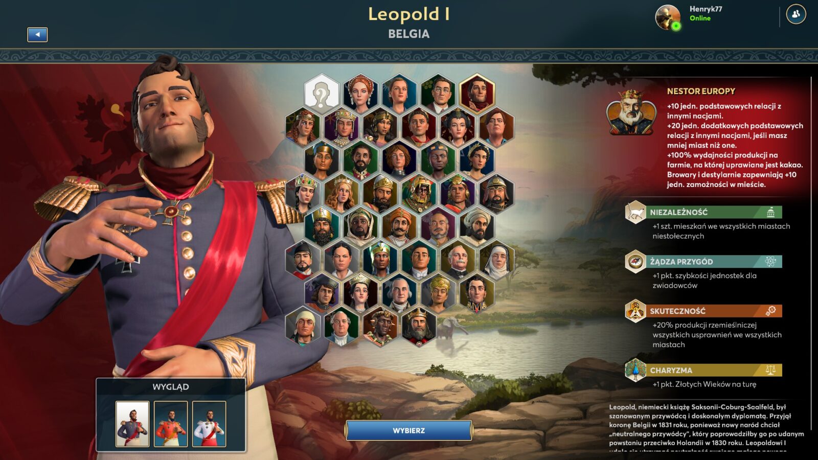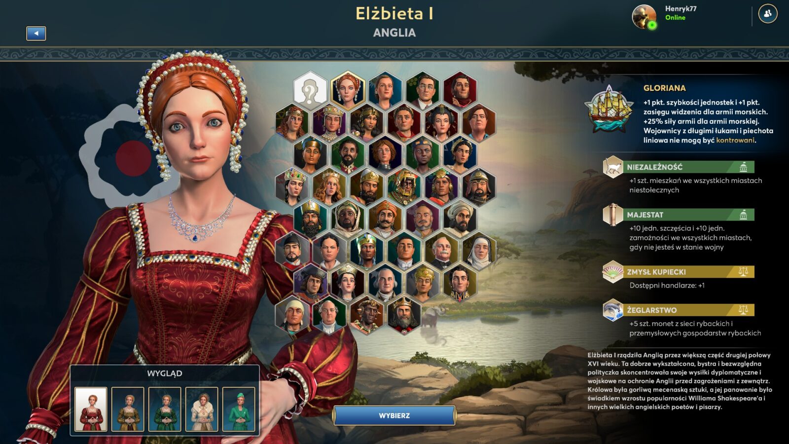 Muszę dodać, że każdy lider ma kilka outfitów – można wybrać z nich jeden. W przypadku niektórych liderów są to różne wariacje tego samego stroju, przy innych są to stroje z różnych epok. Na plus policzę, że mamy nacje z różnych okresów historii. Zrozumiała jest na przykład obecność wspomnianych Chin czy Anglii, ale mamy również Cesarstwo Bizantyjskie, Cesarstwo Palmyry, Imperium Asyryjskie, Nację Wron czy Celtów. Zabrakło mi w tym towarzystwie Sumerów lub Babilonu, ale i tak jest nieźle.