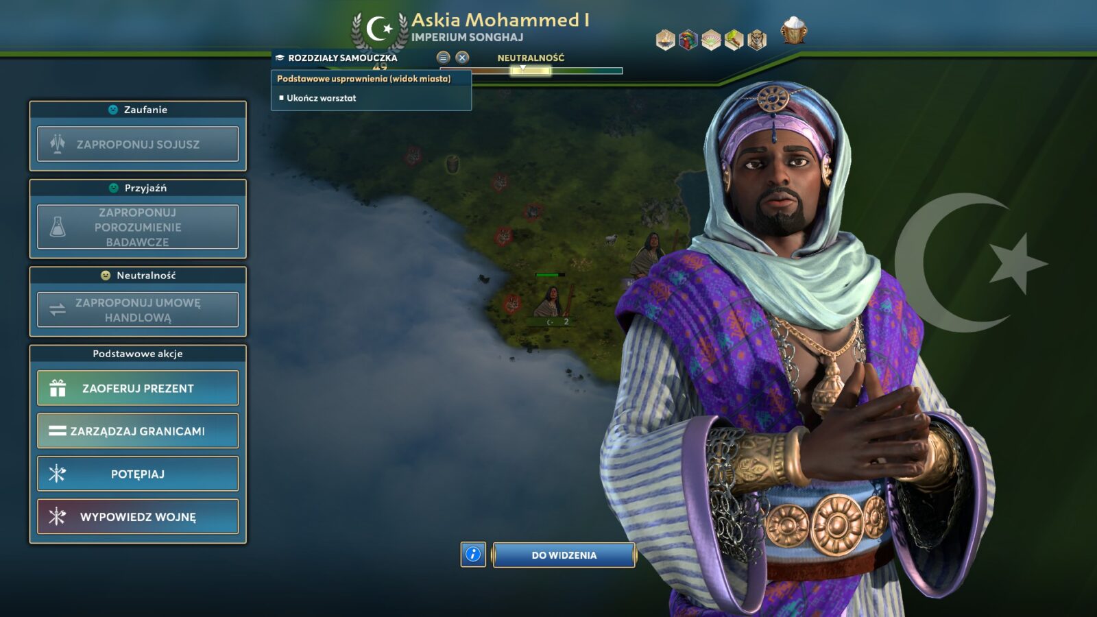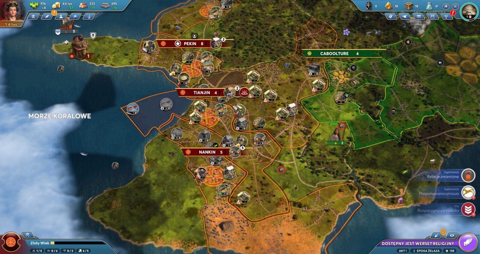Jeśli chodzi o stosunki dyplomatyczne, z innymi nacjami utrzymujemy relację rozciągające się w spektrum od wrogości po przyjaźń. Z tymi, które nas lubią, możemy handlować, zawierać sojusze naukowe i wojskowe, a jeśli kogoś nie lubimy – można wypowiedzieć mu wojnę lub go potępić. Nie powiem – opcje dyplomatyczne są dość ubogie. Handel to jedyny sposób na to, aby pozyskać surowce potrzebne w naszych miastach, a których nie posiadamy na swoim terenie. Dlatego warto dbać o dobre stosunki z sąsiadami, aczkolwiek zajmowanie rejonów w pobliżu ich miast skutkuje pogorszeniem wzajemnych relacji.