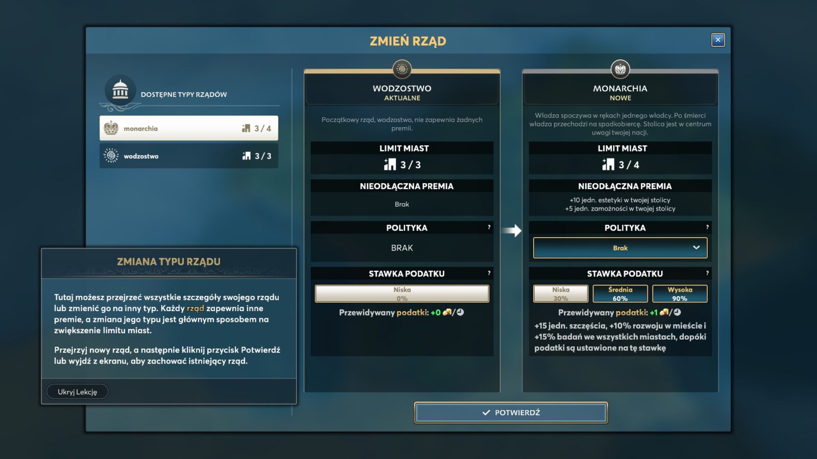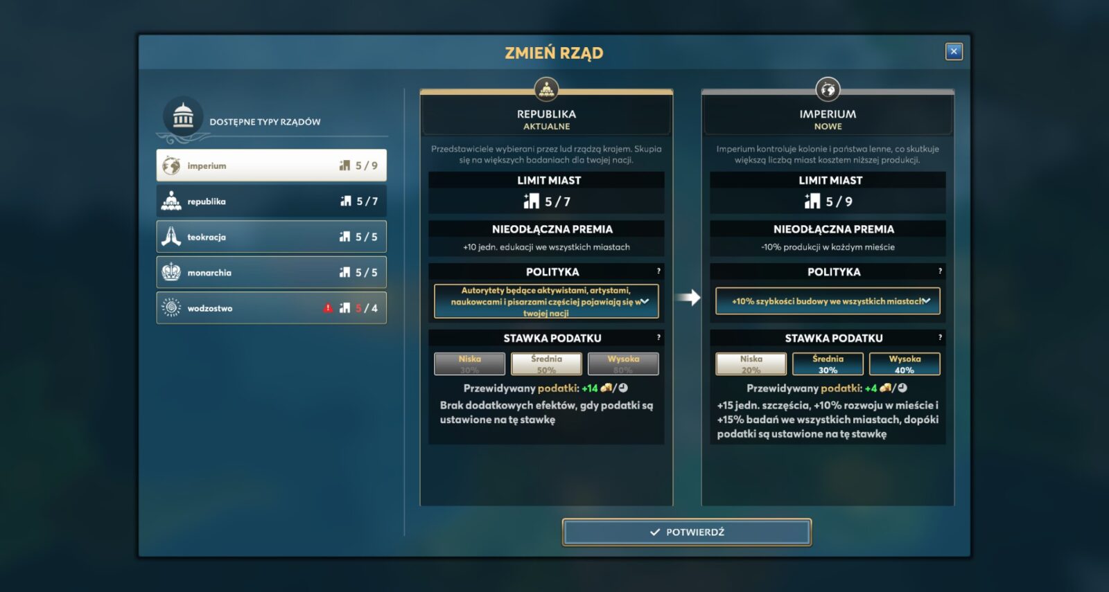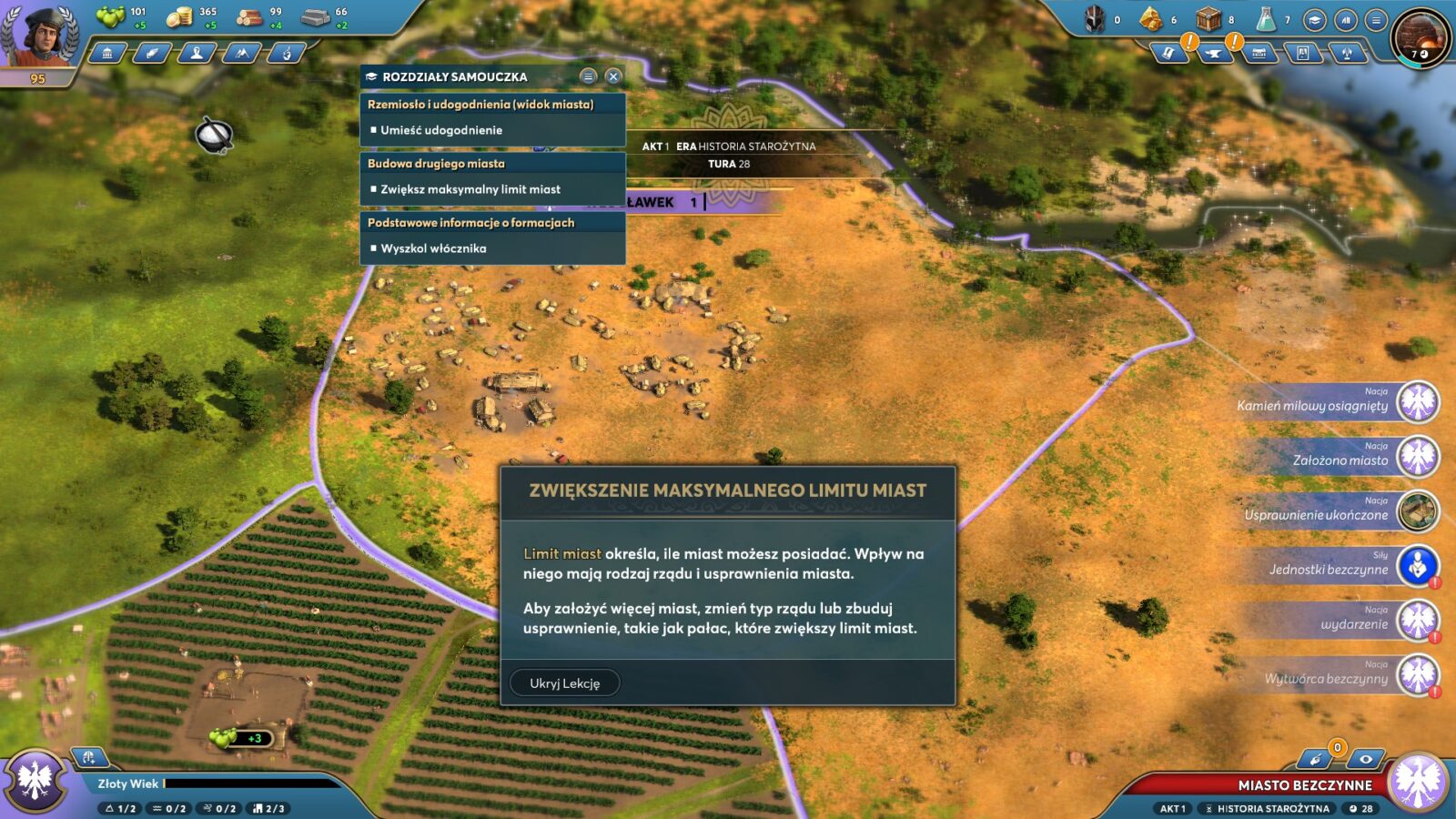 Tu dodam od razu, że nowe miasta możemy zakładać w dowolnej odległości od stolicy. Nie ma tu czegoś takiego, jak “lojalność” zmniejszająca się wraz z dystansem. Ilość siedzib, jakie możemy założyć, różni się w zależności od systemu politycznego, np. pierwotne systemy władzy dopuszczają 4 miasta, a imperium już 9. Jest jednak pewien sposób, który pozwala mieć ich więcej ponad limit bez żadnych konsekwencji.
